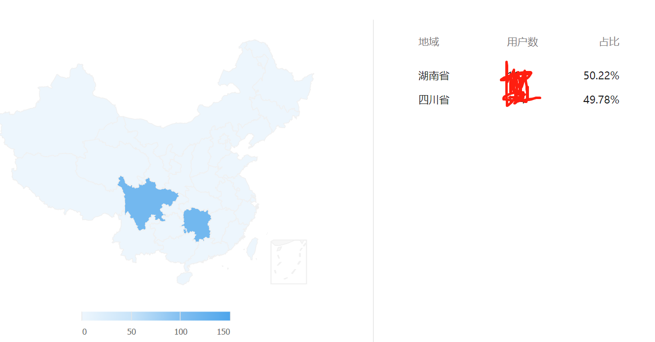 已知用户中有北京等其他城市的,但是显示的只有湖南和四川两个省份(用户数是全的)