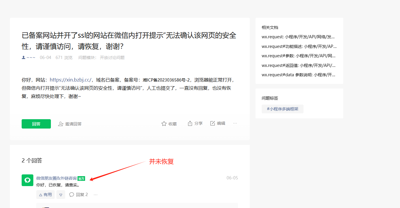 你好,网站:https://xin.bzbj.cc/,域名已备案,备案号:湘ICP备2023036586号-2,浏览器能正常打开,但微信内打开提示“无法确认该网页的安全性,请谨慎访问”,人工也提交了,微信开放平台也反馈了问题,有工作人员说已恢复,但我今日打开又开始提示非微信官方页面了。并没有恢复,麻烦尽快处理下,谢谢~