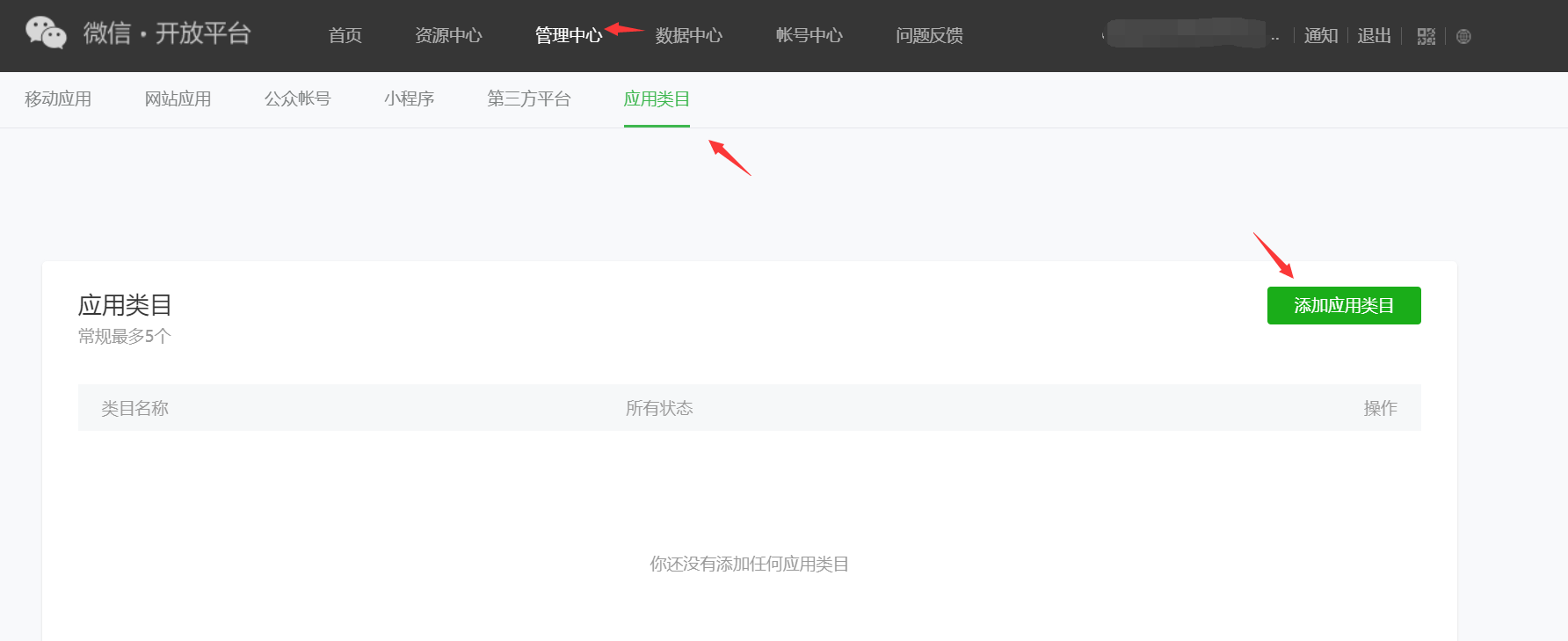 需要你先添加类目,然后创建移动应用时,就可以选择你加的类目了。