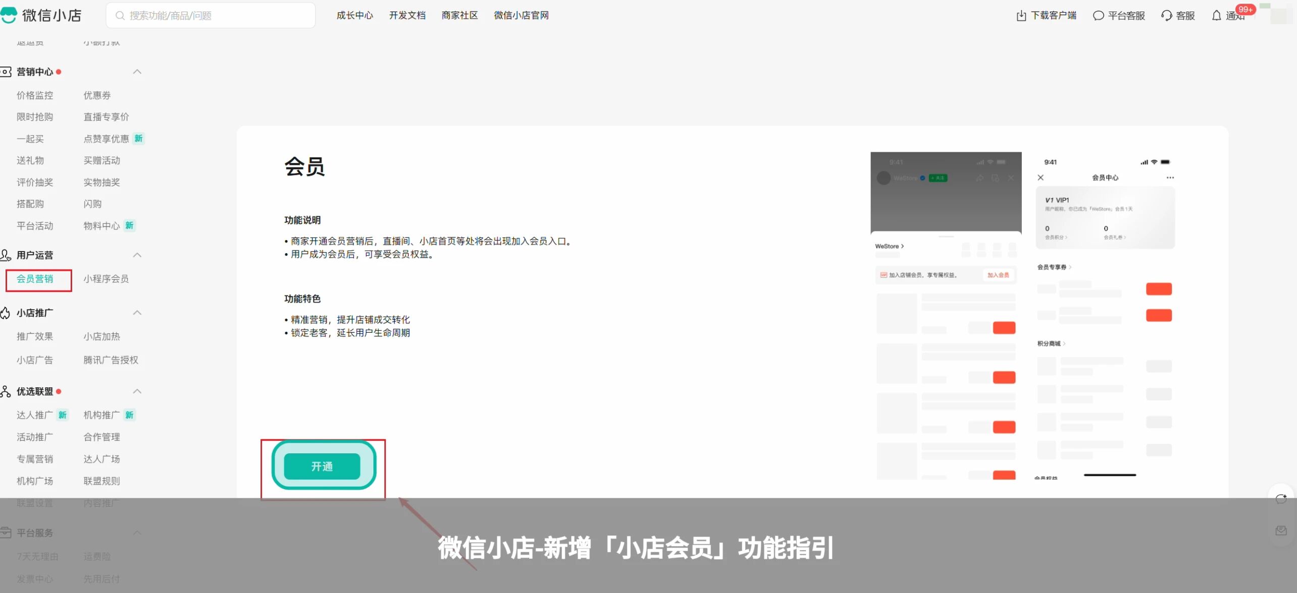 功能简介:为微信小店商家提供的店内原生会员解决方案,无需开发即可快速创建并管理会员体系,满足小店商家对会员进行基础运营与服务的核心诉求。商家成功开通功能后,用户可在小店店铺首页、商品详情页、订单页、直播间购物袋场景一键成为会员。会员在店内购物时,自动享受专属会员权益。