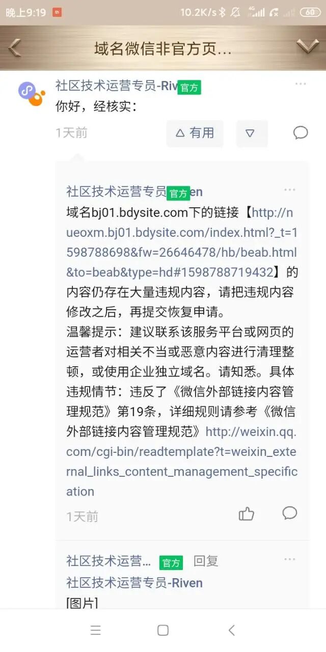 下面的域名微信显示非官方页面,能不能解除这个提示 web6701598639637847.bj01.bdysite.com web5461598558071220.bj01.bdysite.com web3891598558340506.bj01.bdysite.com web3041598558523161.bj01.bdysite.com trues.bj01.bdysite.com 上次说的相关违规页面已经联系百度云封禁 ,求解开,谢谢