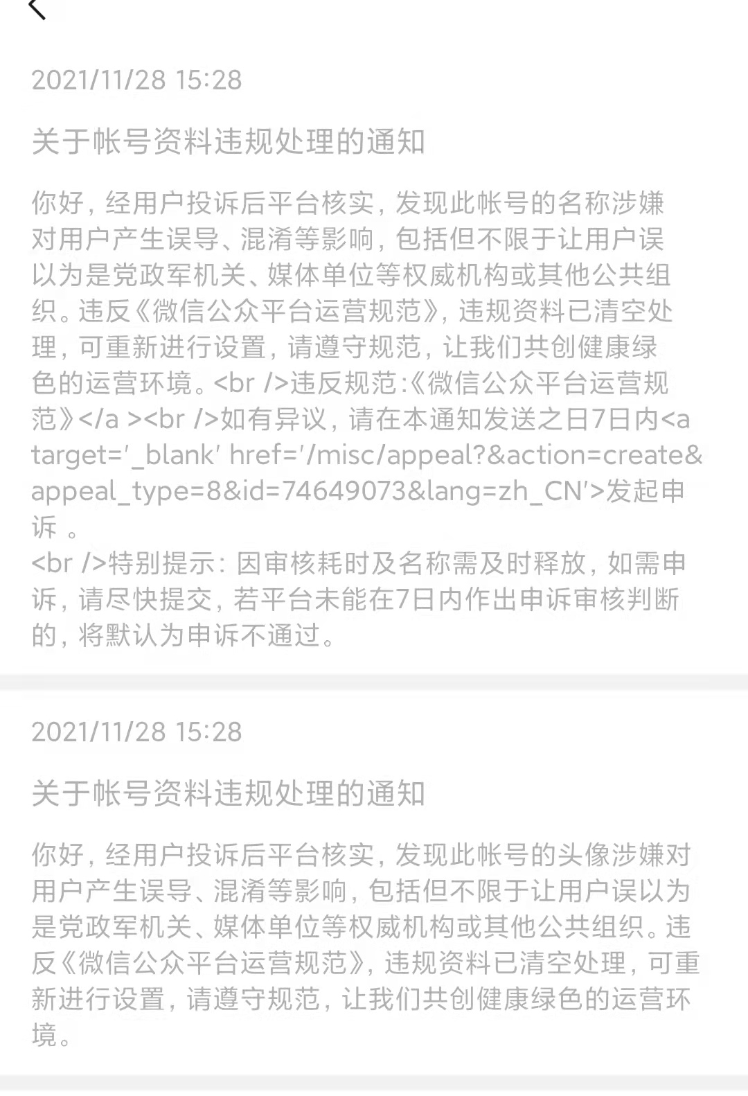 你好管理员,我的公众号:gh_f8ede8be7e23 被官方连续两次清空昵称,第一次清空后,提交了网信办授权备案证明,第三方审核机构通过了,11月28号又被清空了,明明提供了相关资料为什么被清空?如果不认可,那就可以不让审核通过啊!我想请问下,相关资料应该向腾讯哪个部门、哪个入口提交,加入白名单,请不要随意清空了!