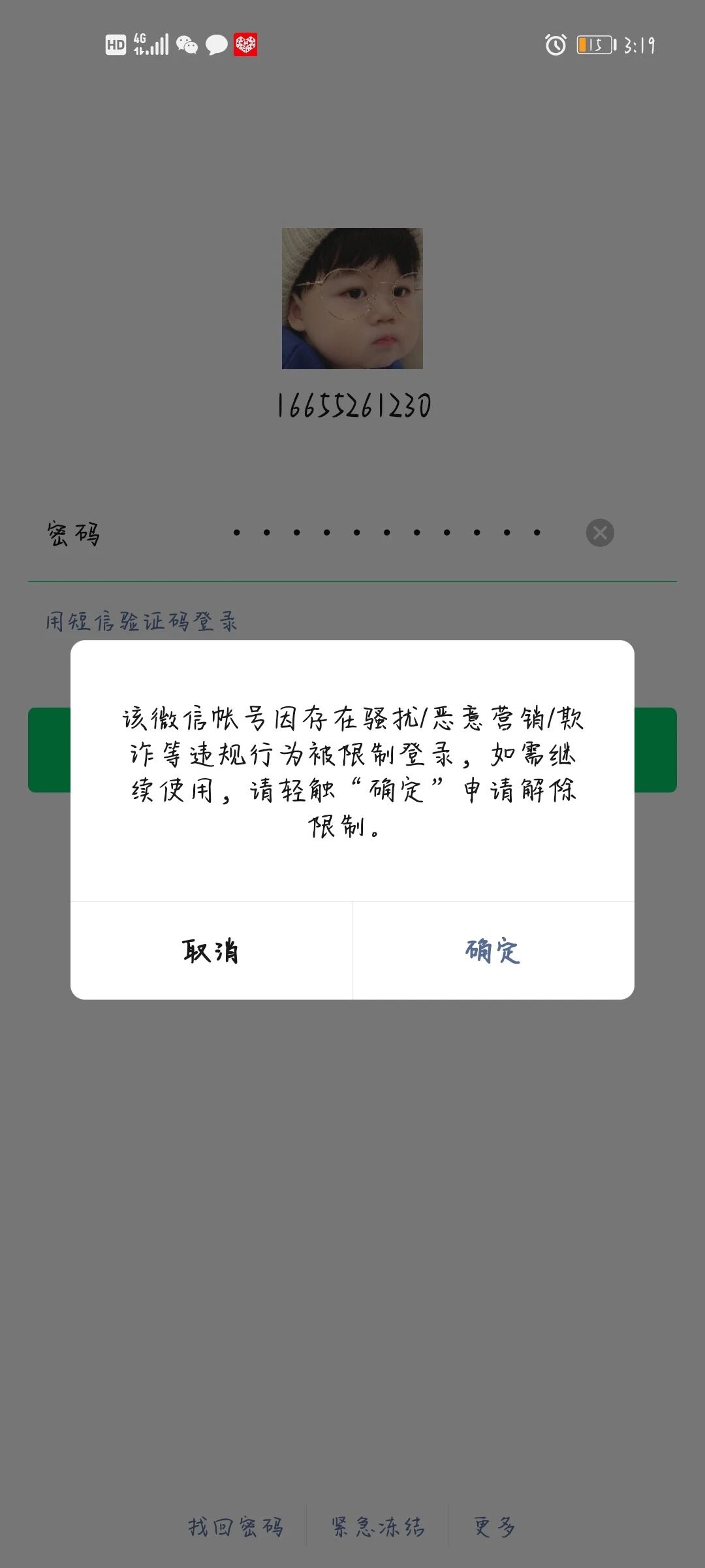 为什么我的微信被限制登陆了,然后还没法解封,解封成功后,显示对方不满足条件(可他明明是满足的啊)然后投诉给客服,客服说,微信账号不存在???有哪位哥哥姐姐知道什么情况的嘛