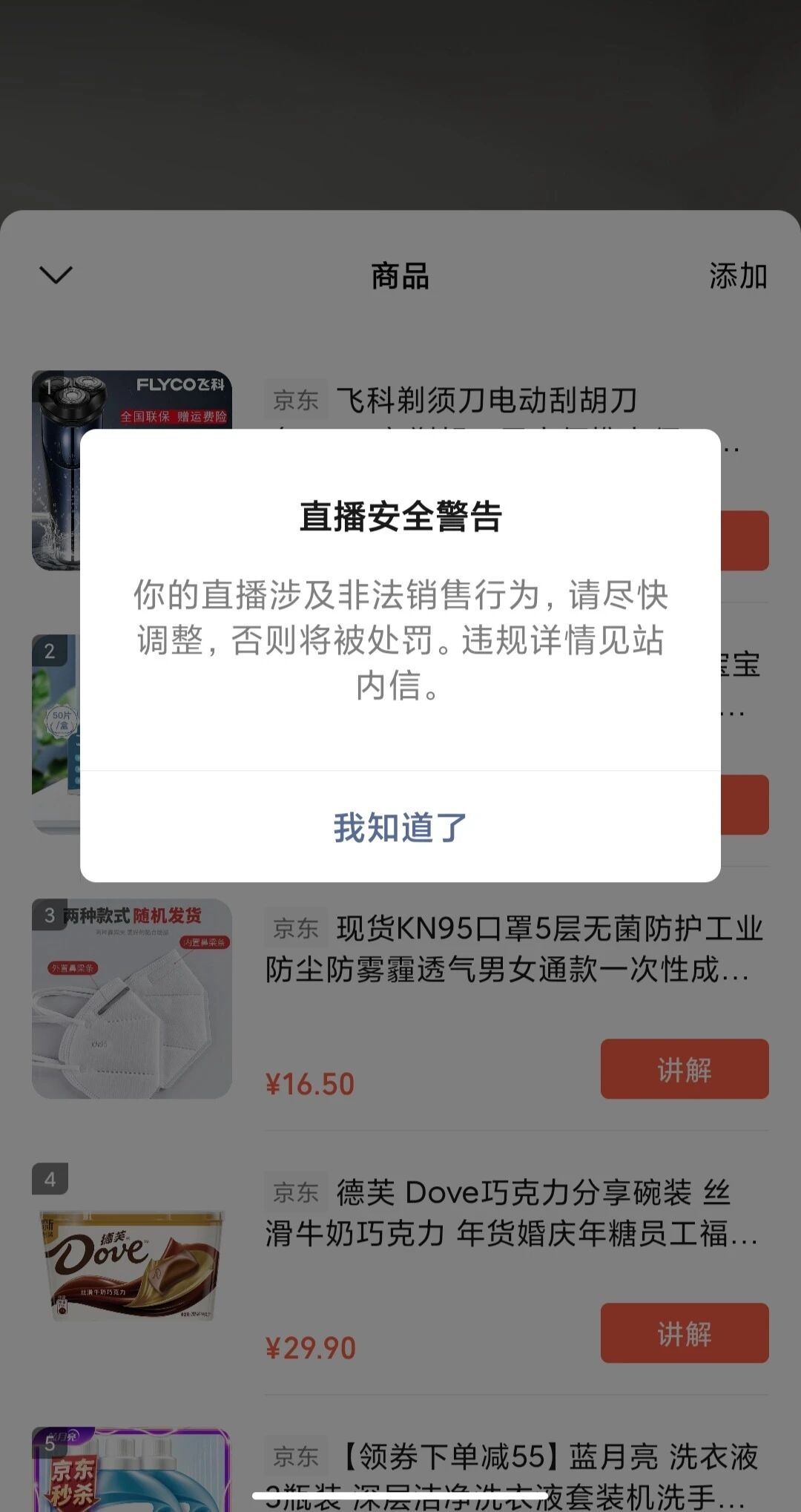 刚刚在视频号,开播2分钟,挂了京东的商品链接,就出现了直播安全警告⚠️,如图所示,有朋友遇到过这样的问题吗?谢谢