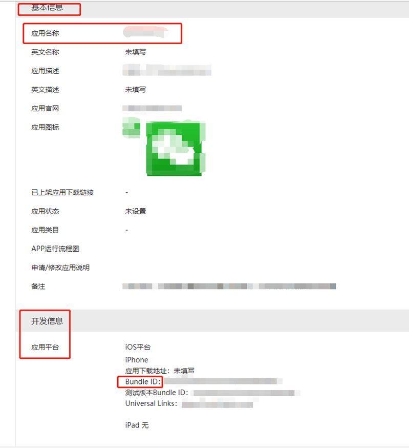 你好,登录微信开放平台帐号,在该应用详情页面,截图含有应用名称、安卓包名、ios bundleid 等信息的页面提供就可以。