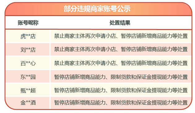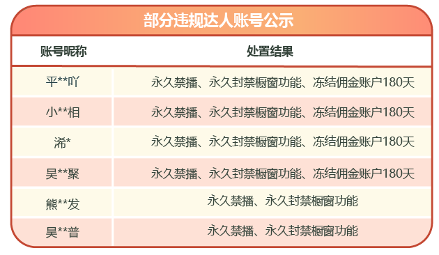以下是近一周被处置的部分情节严重的商家、达人名单: