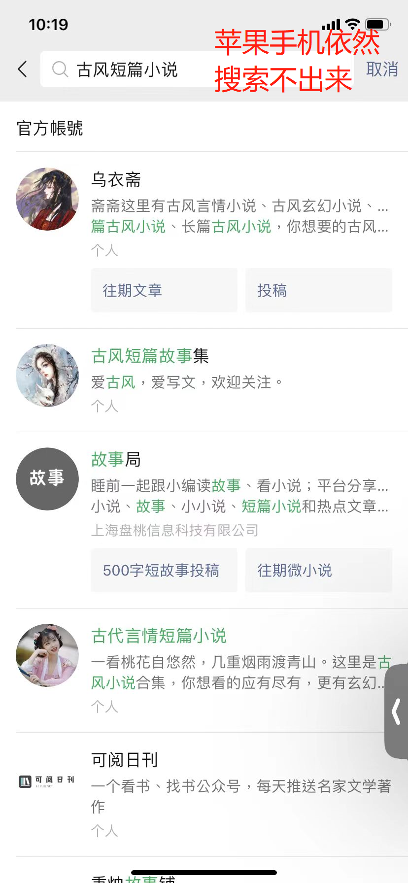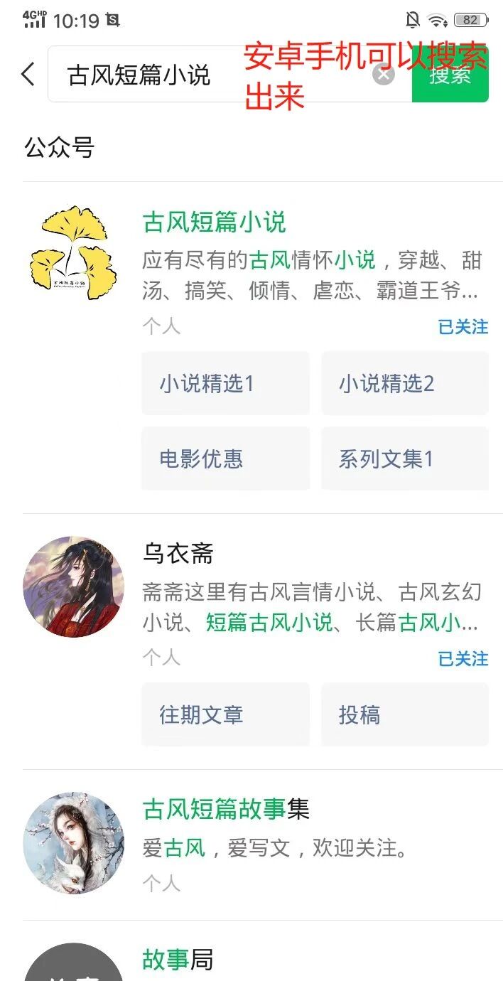 刚刚发布的问题有技术人员为我解答万分感谢,但是我试着搜索了一下发现,问题根源在于电脑端和安卓手机端搜索“古风短篇小说”或者“古风”都是可以搜索到的。但是苹果端用户去搜索以上关键词还是搜索不出来的状态,我各测试了3台安卓机和3台苹果机都发现苹果手机搜索不出来的情况(附图见下),请帮忙处理解决!万分感谢!