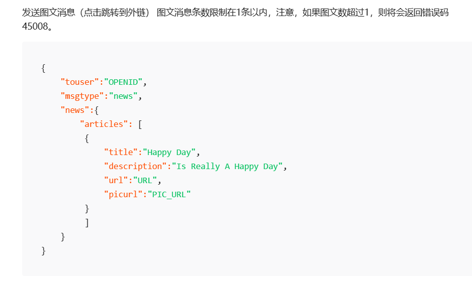 微信公众号发送客服图文消息目前是这种格式,能否按照这种格式发送这是微信客服消息发送图文消息文档求助大佬