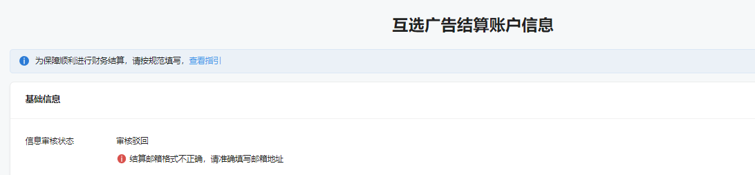 2、互选广告结算账户信息填写完,提交时一直显示提交失败,也没有提示失败原因,麻烦看下