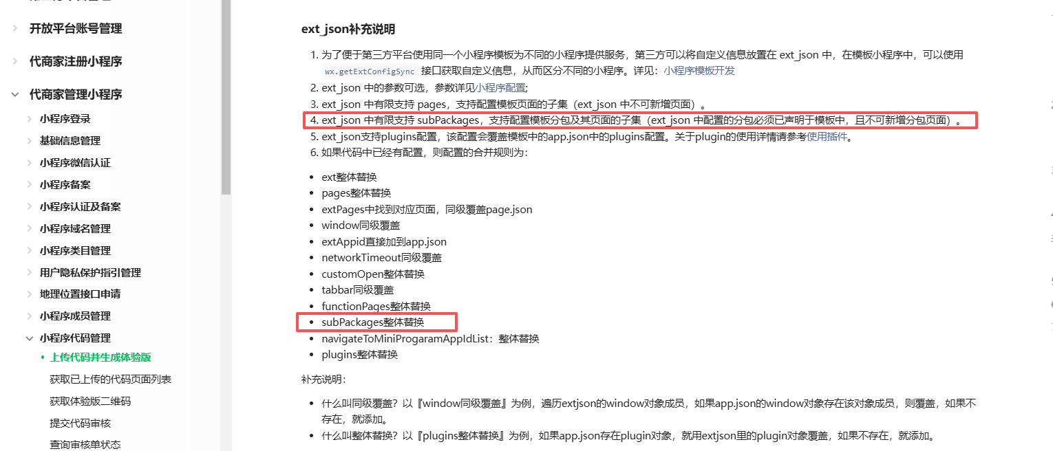 你好,subPackages与extAppid、ext等参数同级,按照分包文档描述的参数到ext_json中配置下试试
