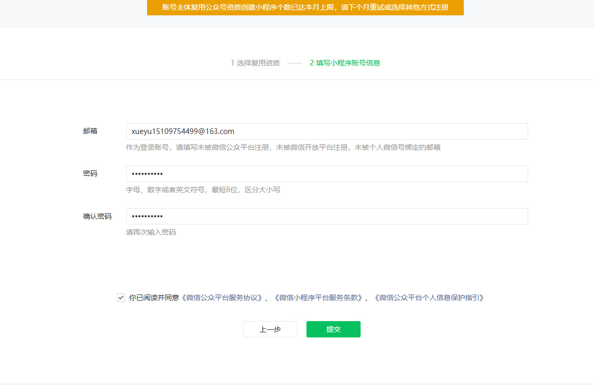 我公司重新上月重新申请的一个新的公众号,这个月月初需要注册2个小程序,目前已经注册一个了,使用第二个的时候提示我只能一个月注册一个,这个我都没有看到哪里有说明的,为什么我之前的公众号又可以注册多个呢