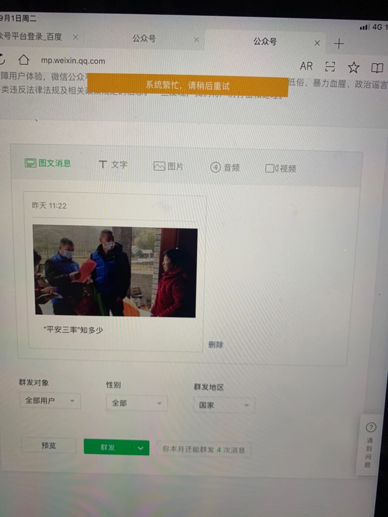 公众号群发一直显示系统繁忙,用了各种浏览器都不行