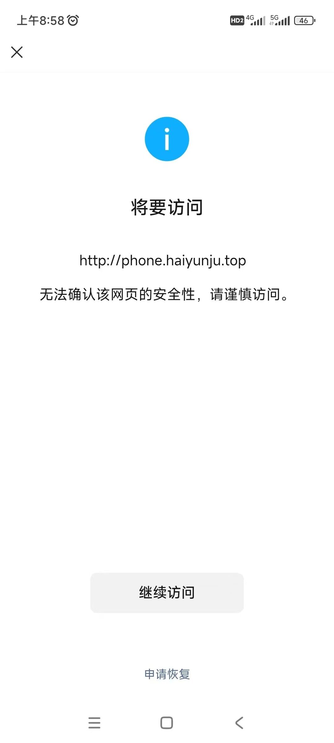 您好。域名phone.haiyunju.top为公司官网,经自查,无任何违法违规内容。请解除拦截提示。