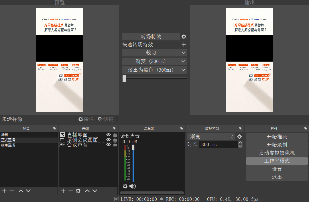 本次直播是我们于2023年光博会现场会议室进行的圆桌会谈,全程真人出镜。直播采取的方式是腾讯视频号直播支持且鼓励的由OBS配置好直播主题界面+远程会议采集真人出镜交谈画面(附直播配置截图如下),同时为了确保观看体验,我们现场还用了专业的导播设备做好画面切换以及信息补充,在保证垂直领域产业深度内容输出的同时,也保证了直播画面的美观性、提高观众的观看体验。