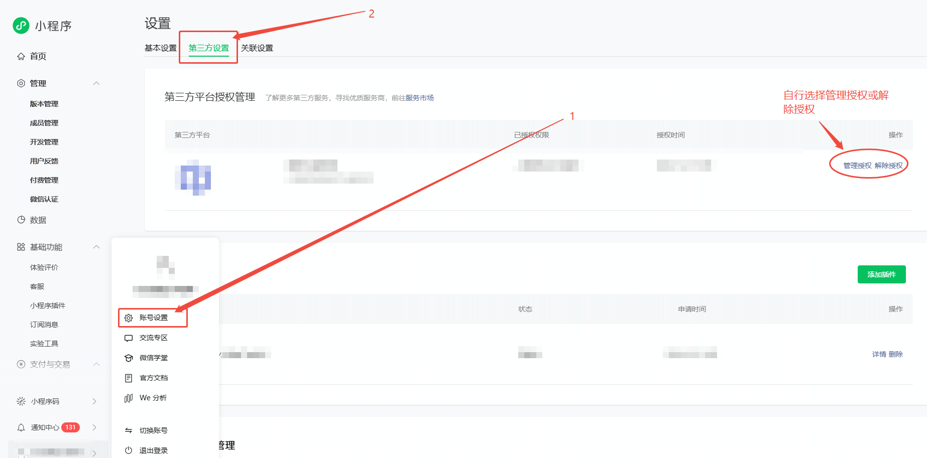 2、核实小程序wx15cb291b5f01bd3c已将18、25权限集授权给A第三方平台,可以自行登录至mp后台(https://mp.weixin.qq.com/)查看