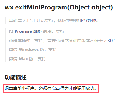 在设备端小程序尝试使用第三种方法直接调用wx.exitMiniProgram方法退出小程序,但无效果,此api必须要用户有点击效果才能调用成功,请问还有其他方案通话结束后自行退出小程序吗?