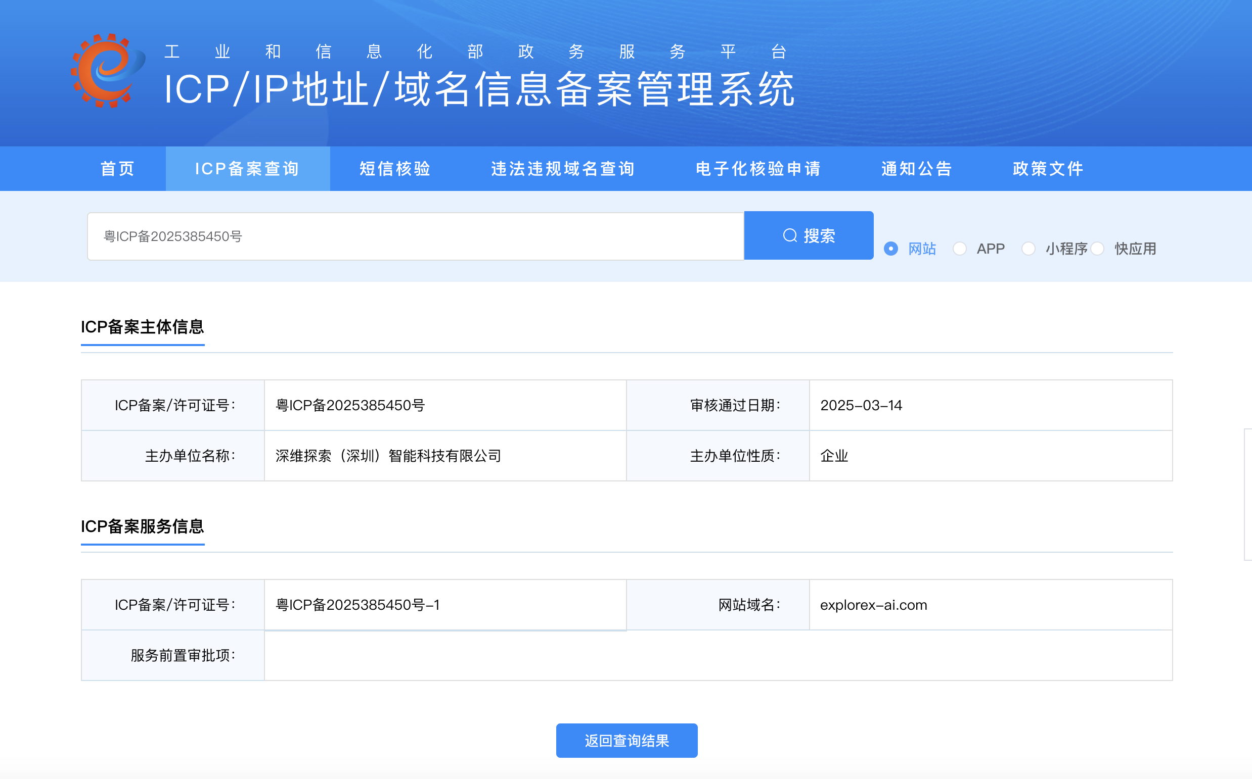 您好,域名www.explorex-ai.com 已备案通过,浏览器访问正常,我是网站开发者,网页内容如下,访问时间为2025.12.3日 14:10 。微信访问网站出现“已停止访问该网页”,腾讯安全中心检测无异常。