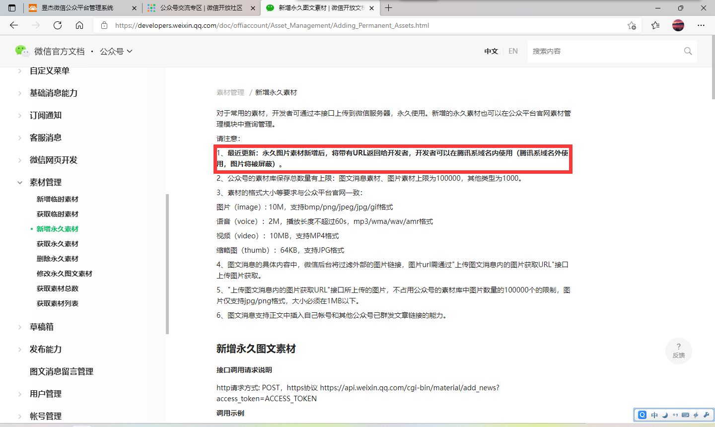 这里貌似有一个问题,微信提供给我们相关的接口,可以获取微信公众平台的永久图片素材,那又不能正常显示,这个接口的意义何在呢?我们普通的开发者,也不能将开发好的程序放到腾讯系的域名下允许呀,你们官方估计也不会允许吧?还是说这个接口只提供给有腾讯系域名权限的开发者使用呢?