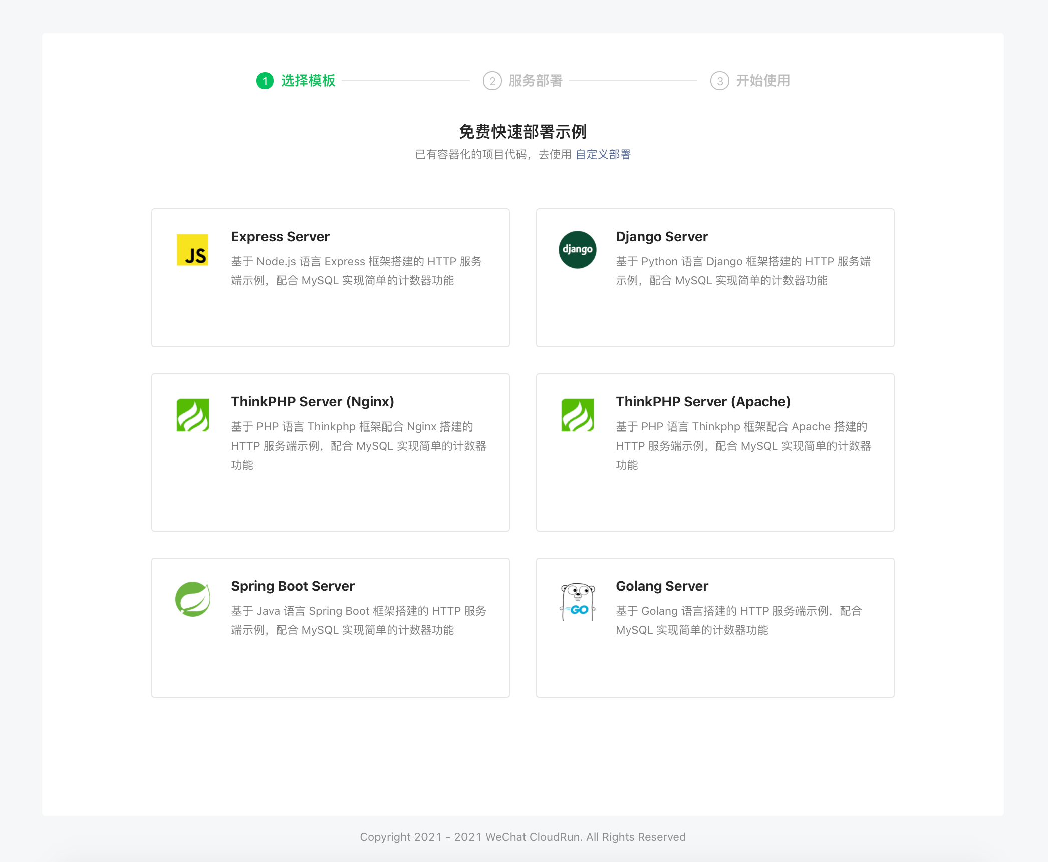 微信云托管已支持无门槛快速部署服务,在云托管控制台,可以选择预设的开源框架快速创建一个微信云托管服务,并通过各种调用方式发起对服务的请求,大幅降低上手门槛。