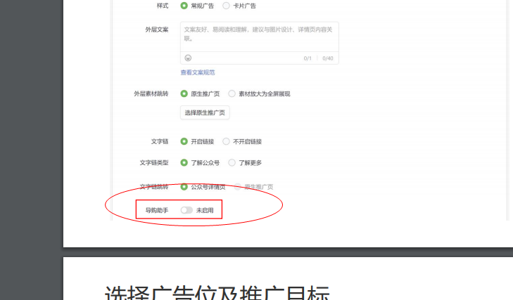 哪位大大帮我看看啊,谢啦!我们公众号开通了对话功能、广告主,也添加好了顾问老师,但是现在做微信广告推广公众号时,创意里没有导购助手选项啊(没有图中的这个选项)?做微信广告时还需要什么申请吗?