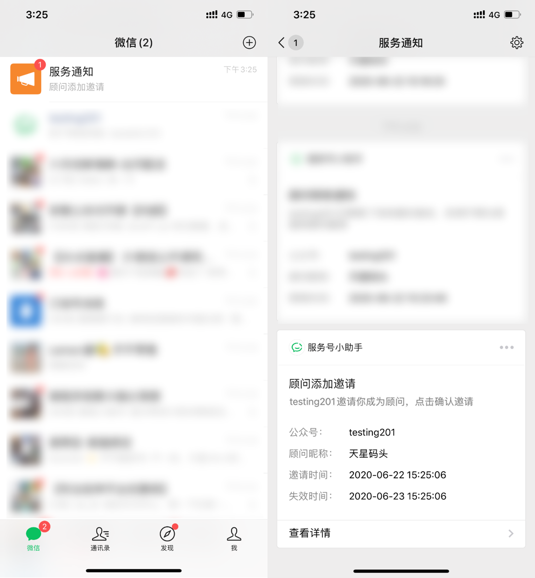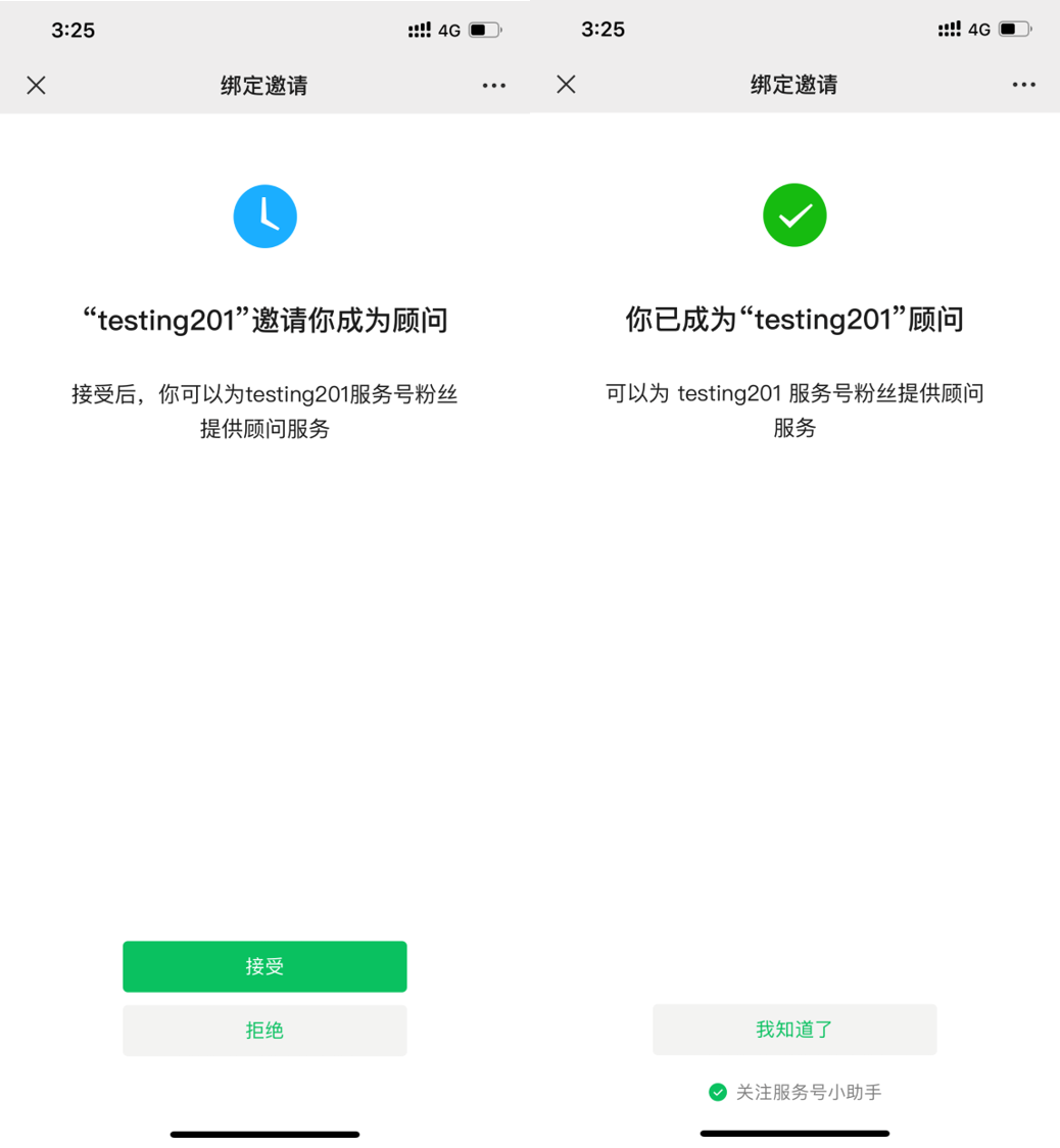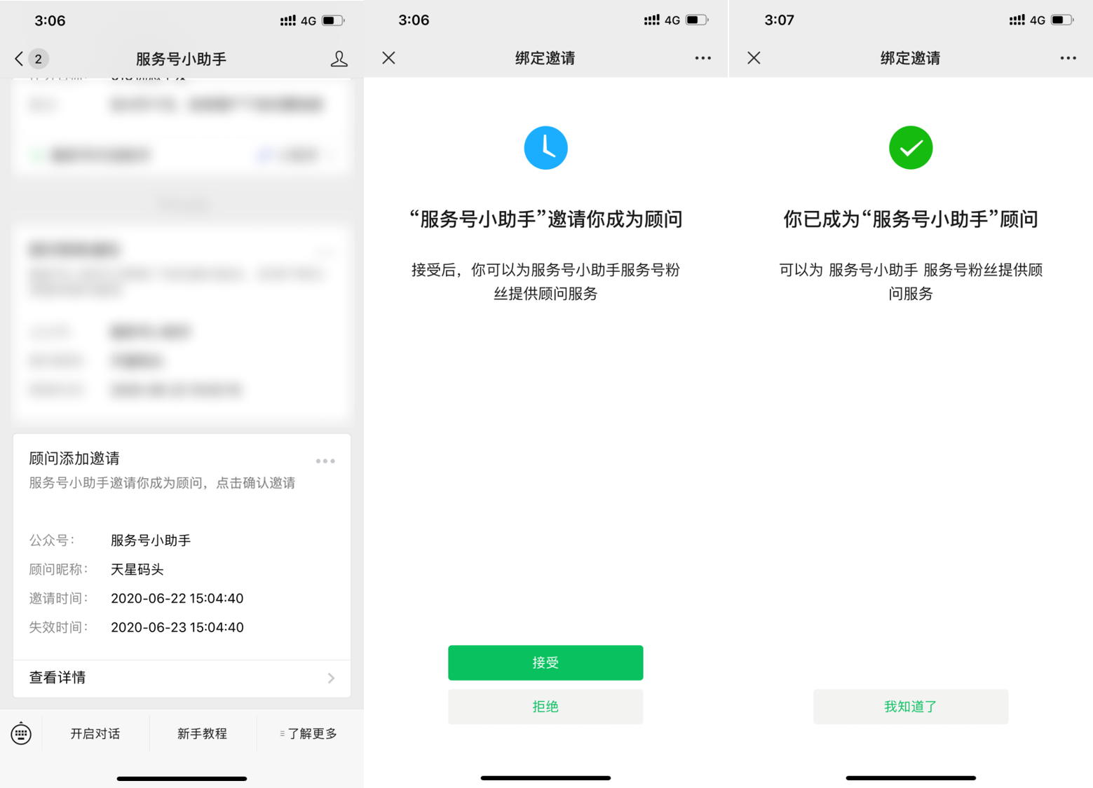 顾问需在收到添加邀请的24小时内点击微信发送的通知进行确认,过时将失效,服务号运营者需再行发起顾问添加邀请。详情可查阅《产品文档》