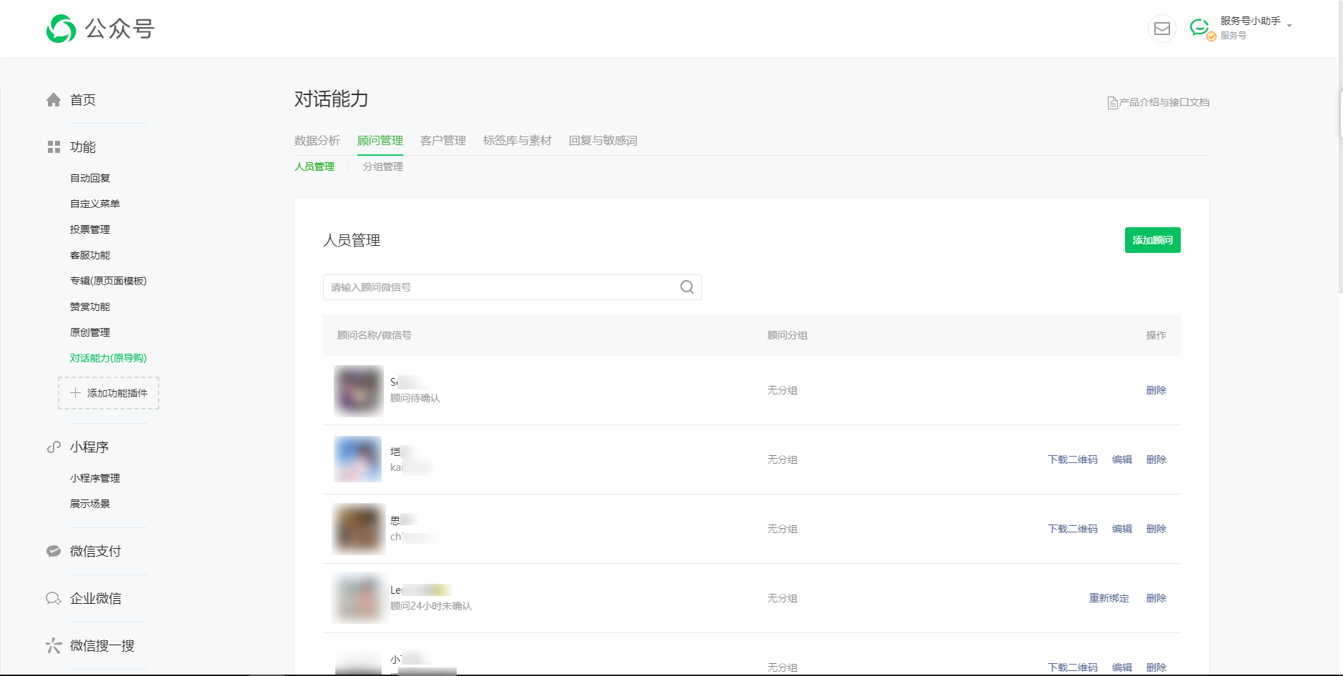 - MP:对话能力(原导购)-顾问管理-人员管理的列表中,顾问还未确认的,会显示“顾问待确认”;顾问已确认的,会显示该顾问的微信号;顾问超过24h还未确认的,会显示“顾问24小时未确认”,且要进行重新绑定。