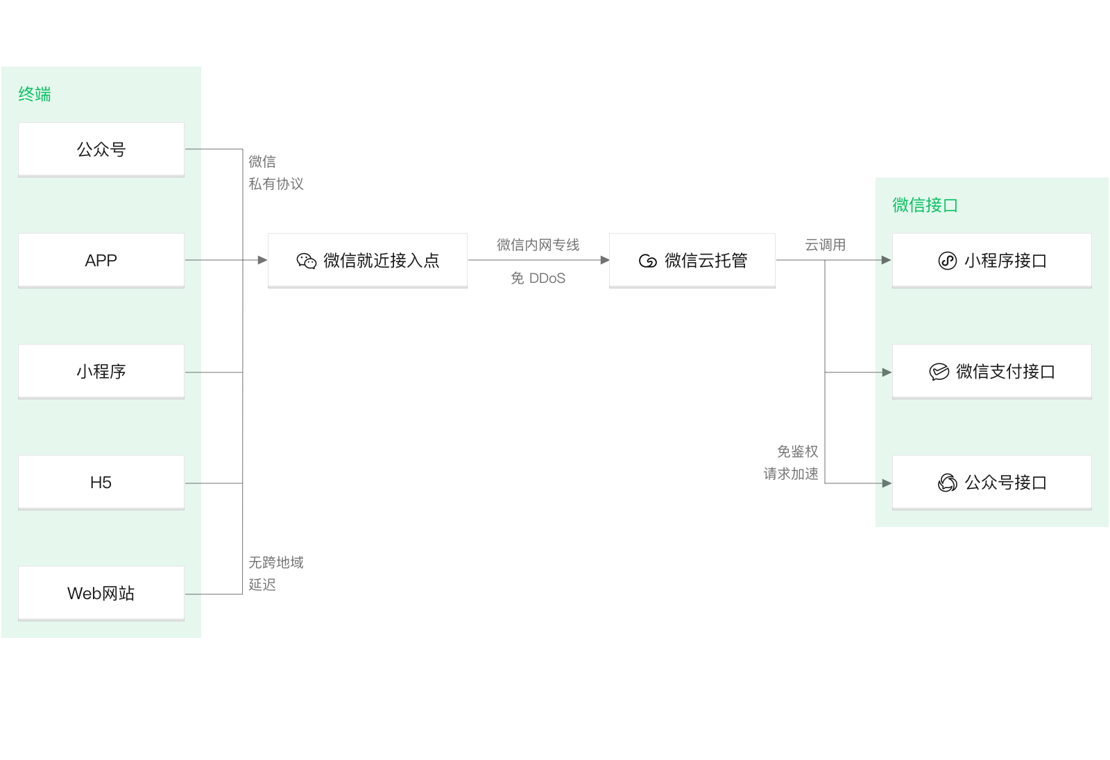 下图中的公众号、小程序走微信内网专线,这可以理解,但对于 H5和Web网站,它的来路是随意的,如何保证走微信内网专线?