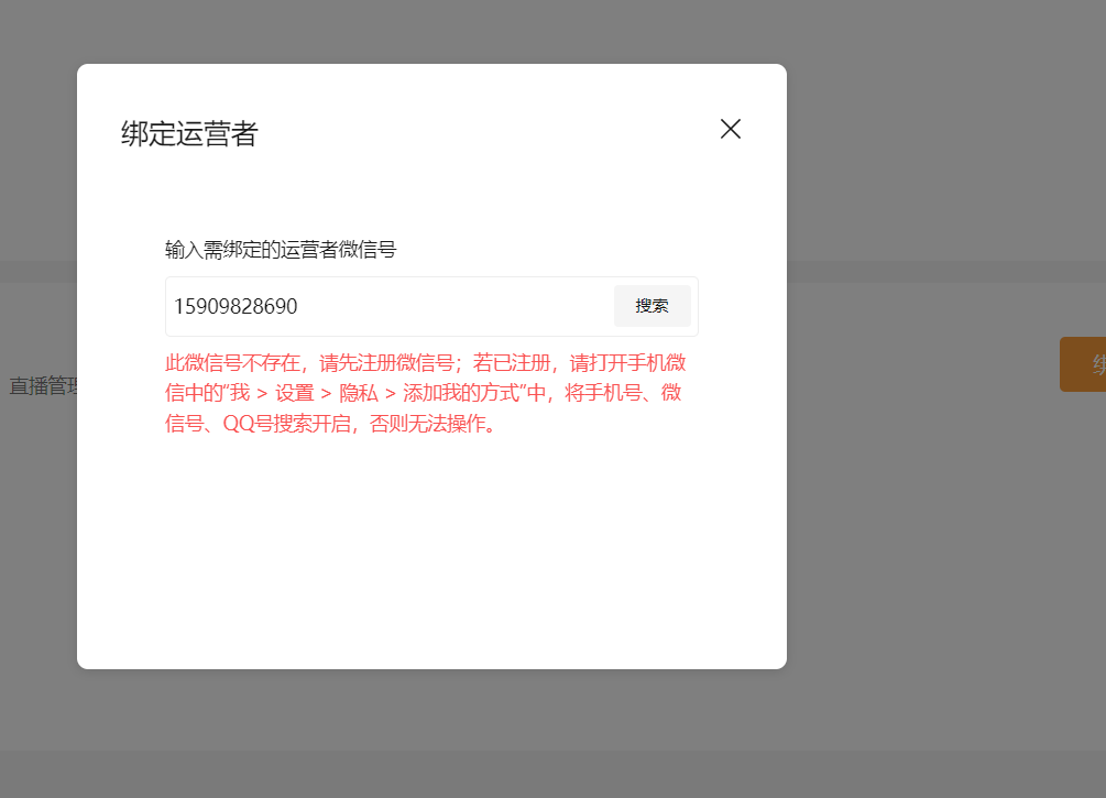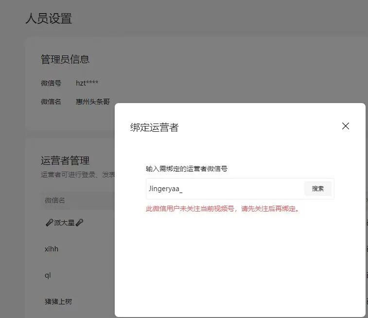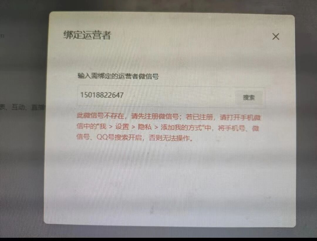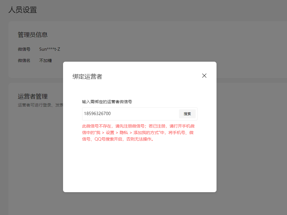 4、问题描述:添加运营者的时候,搜索不到微信号