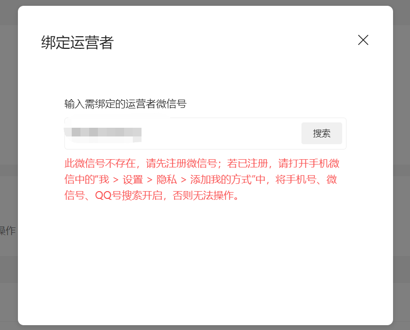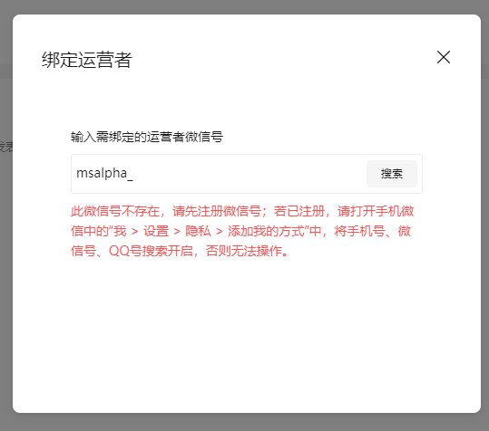 4、问题描述:添加运营者的时候,填入运营者微信号,但是显示微信号不存在