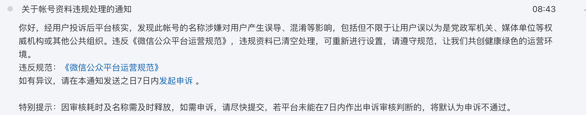 管理员您好,我的公众号名称叫:华人同城网,刚刚收到消息称昵称涉嫌违规被删了,我很不解这个昵称是哪里混淆官方机构了?明明写的是华人同城啊,国内也没有官方机构或者公共组织叫这个的。麻烦管理员帮我看看好吗?谢谢了