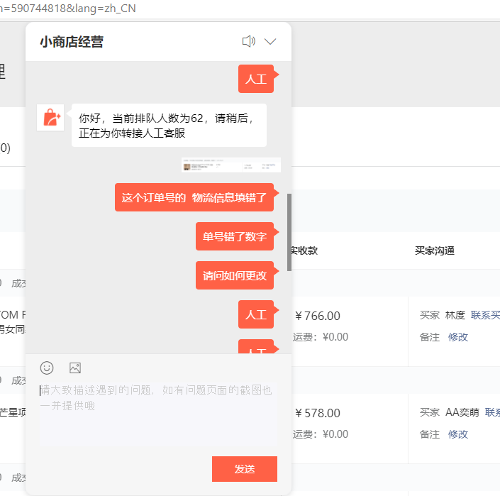 我已经开通了小商店 在发货时填错了 快递单号 想更改 但没有这个选项 人工客服 如图 真是不回复啊 可以直接告诉我更改的方法吗 如图 急急急!?