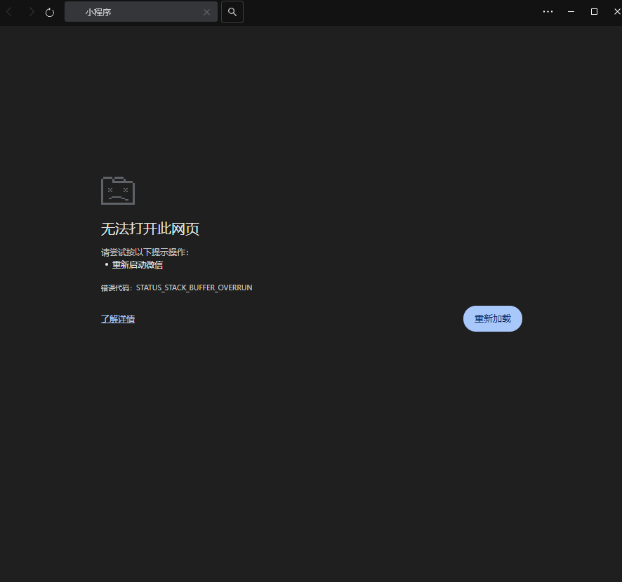 但是这个程序即时手动按结束后还是会自己出现呀,然后现在打开小程序都是这个样子了,无法打开网页,显示错误代码:STATUS_STACK_BUFFER_OVERRUN