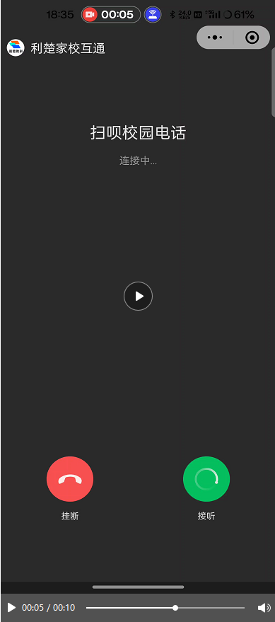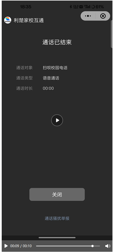 学校:国科共青城实验学校 学生:张可欣 groupId=wxf830863afde621ebWmpfVoip10737741368872736746 , SN:3002338000679,故障时间:2024-01-16 18:35:40,家长微信小程序语言通话点击接听立马显示通话已结束,微信返回:通话未接通,接听方占线,麻烦帮忙查一下原因
