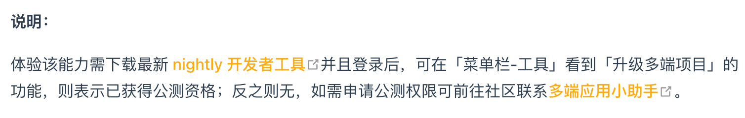 我登录Dount平台,创建了多端应用并绑定了小程序,但是下载最新版的微信开发者工具nightly并且登录后,没有在「菜单栏-工具」看到「升级多端项目」的功能,请问一下这是什么问题?我需要怎么去解决?@多端应用小助手