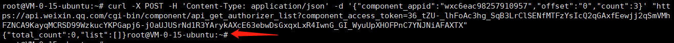 curl -X POST -H 'Content-Type: application/json' -d '{"component_appid":"wxc6eac98257910957","offset":"0","count":3}' "https://api.weixin.qq.com/cgi-bin/component/api_get_authorizer_list?component_access_token=36_tZU-_lhFoAc3hg_SqB3LrClSENfMTFzYsIcQ2qGAxfEewjj2qSmVMhFZNCA9KayqMCRSD99WzkucYKPGapj6-jOaUJUSrNd1R3YArykAXcE63ebwDsGxqxLxR4IwnG_GI_WyuUpXHOFPnC7YNJNiAFAXTX"