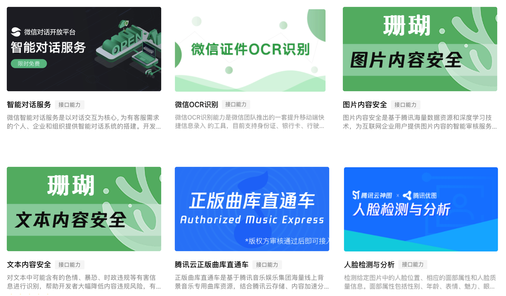 提供来自微信团队、腾讯云、腾讯音乐在内的近30项接口、插件能力,例如OCR识别、珊瑚内容安全、人脸检测与分析等,可供开发者在开发小程序过程中使用,实现基于接口的服务能力。