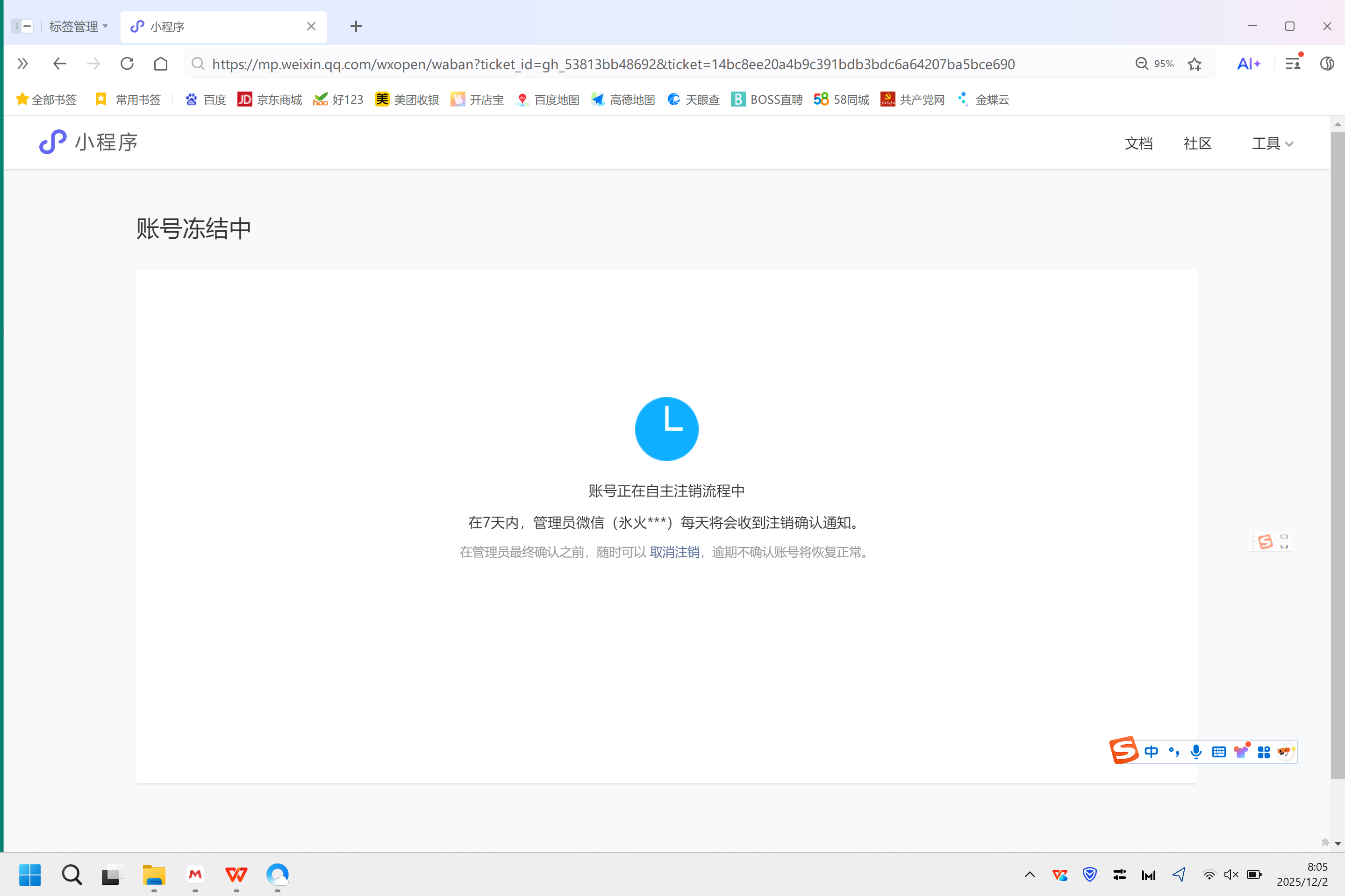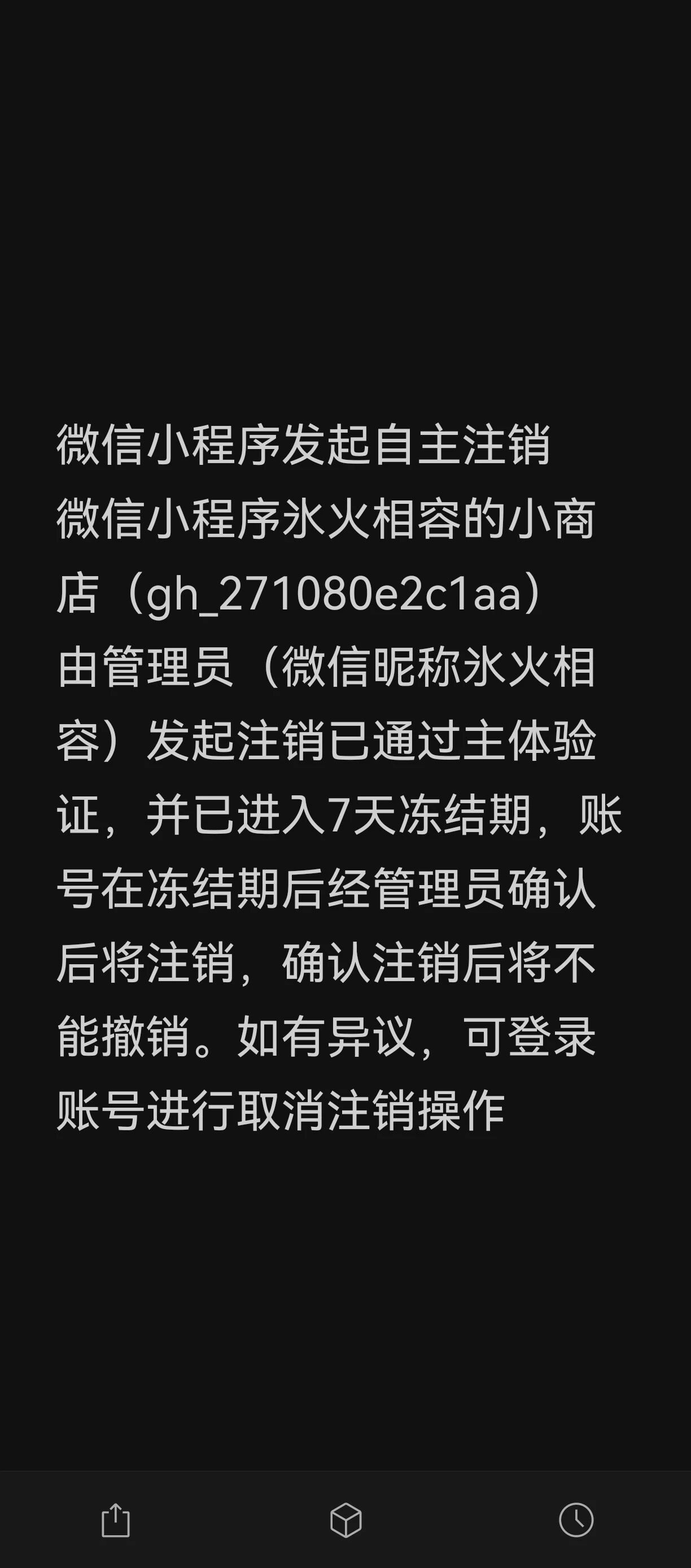 微信小程序发起自主注销 微信小程序氼火相容的小商店(gh_271080e2c1aa) 由管理员(微信昵称氼火相容)发起注销已通过主体验证,并已进入7天冻结期,账号在冻结期后经管理员确认后将注销,确认注销后将不能撤销。如有异议,可登录账号进行取消注销操作
