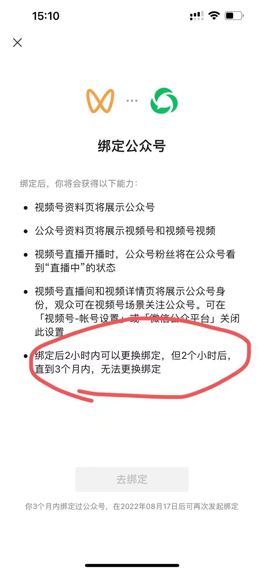 现想将视频号和公众号绑定,出现问题是提示3个月内无法再次绑定,请您帮助解决一下,现在急需要这个功能,万分感谢!!