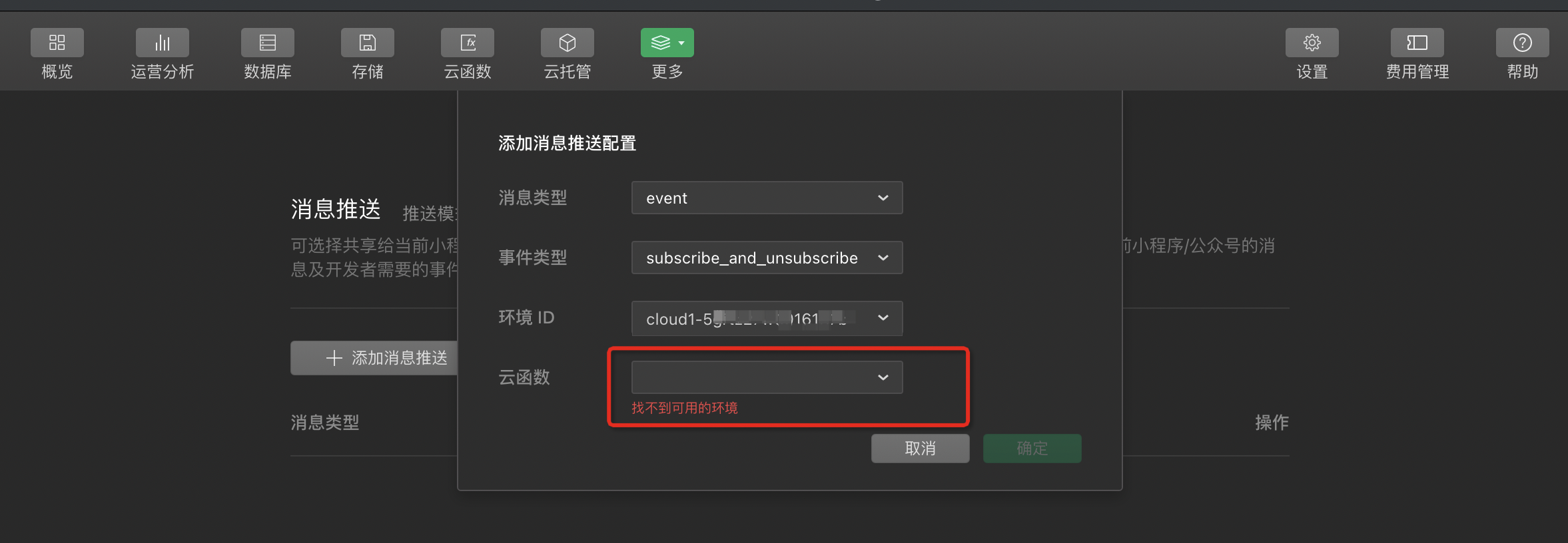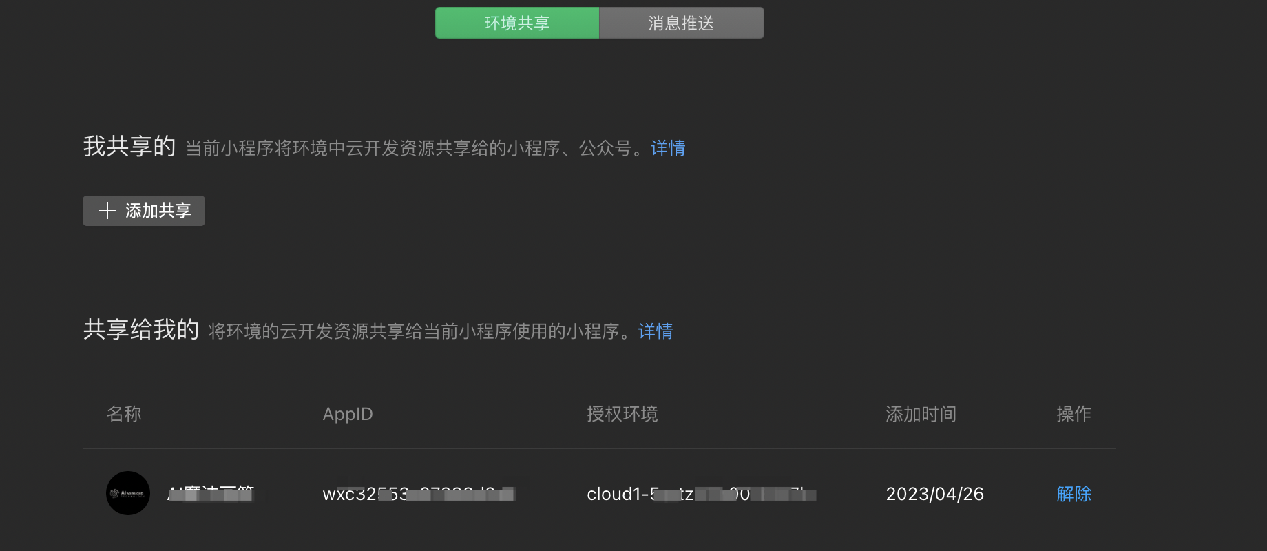 小程序环境共享给了订阅号,在订阅号云开发的环境共享中时,添加消息推送时,找不到小程序共享的环境和函数。但是在环境共享列表又是可以看到的。