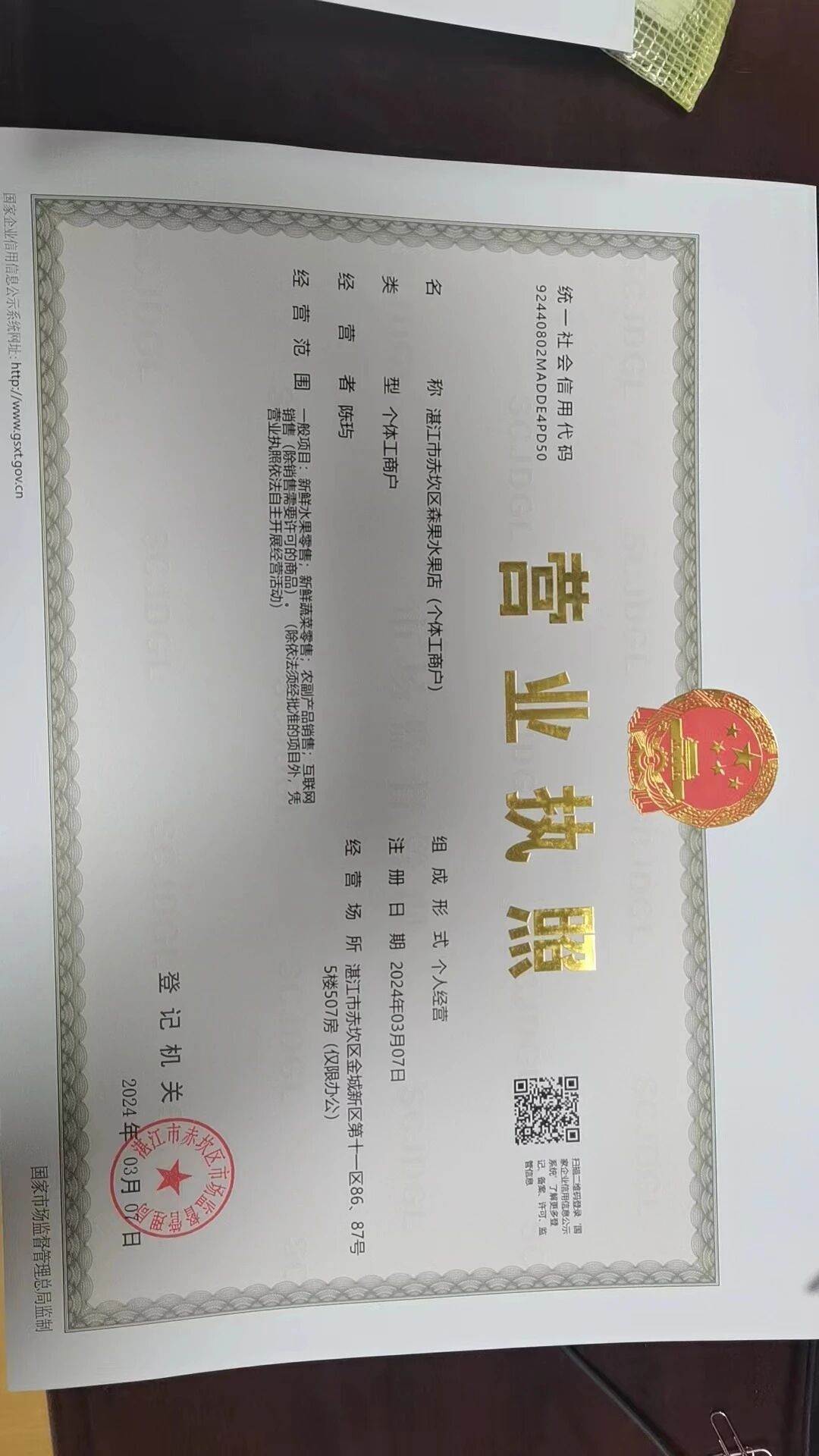 执照名称:湛江市赤坎区森果水果店(个体工商户)