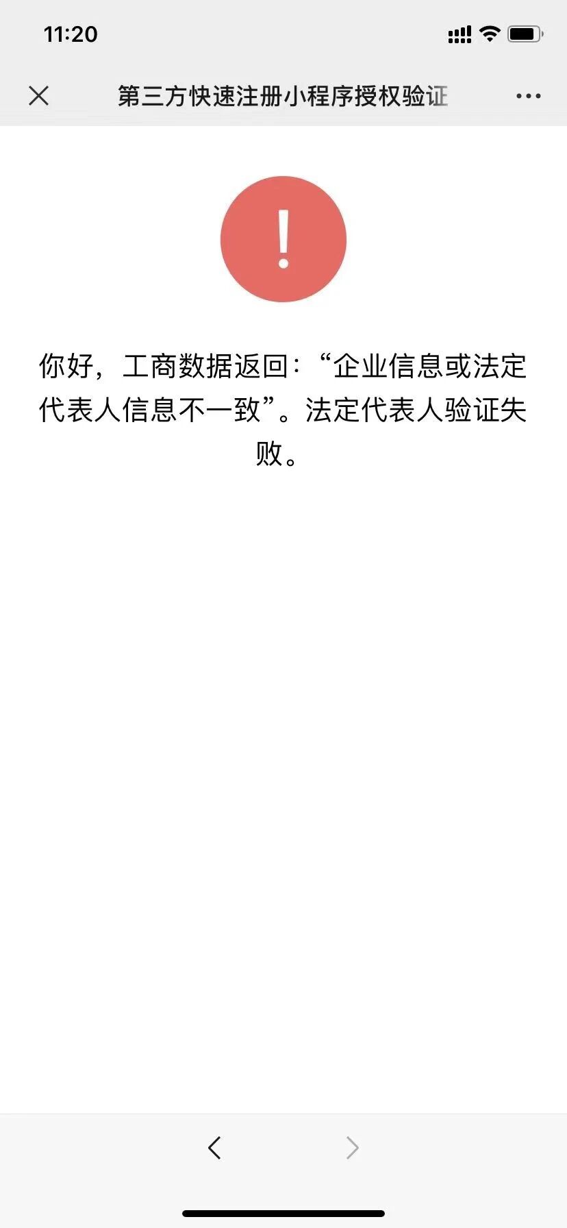 以下微信认证提示:工商数据返回:“企业信息或法定代表人信息不一致”。执照未更过,提示如图所示。请问如何解决?
