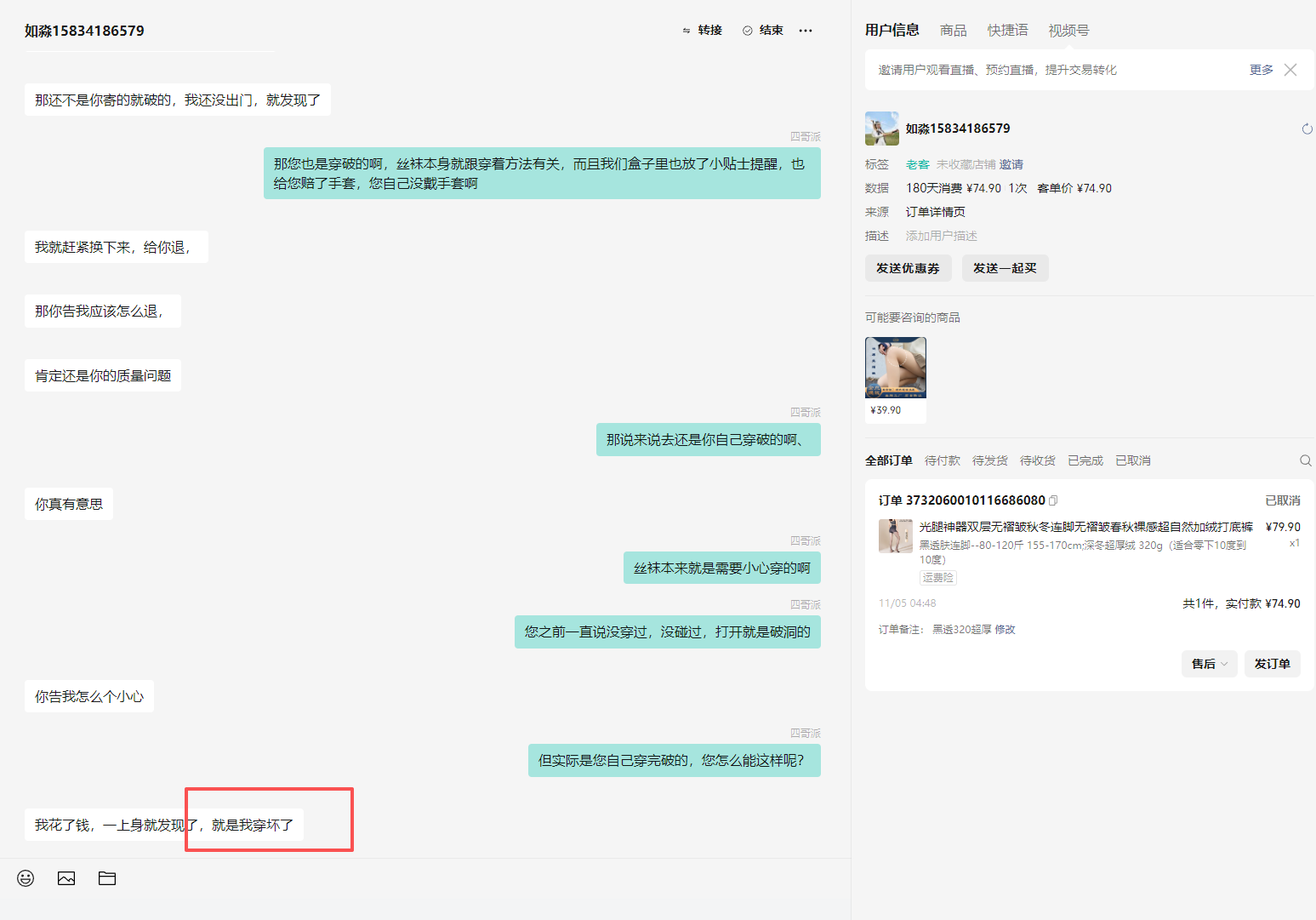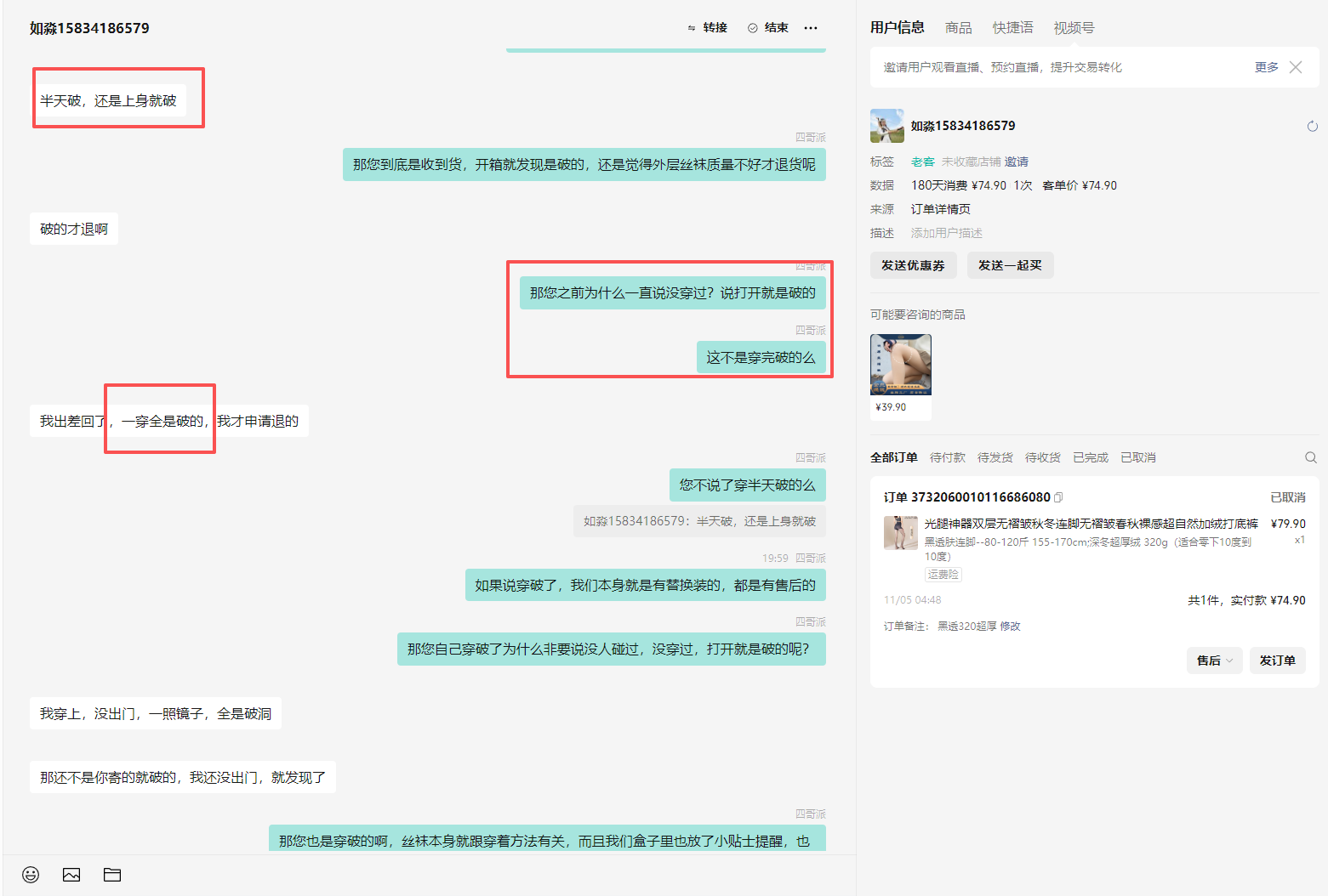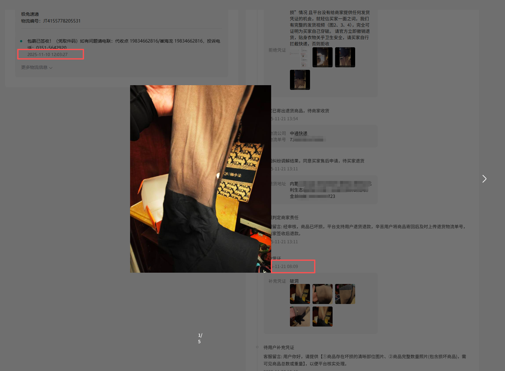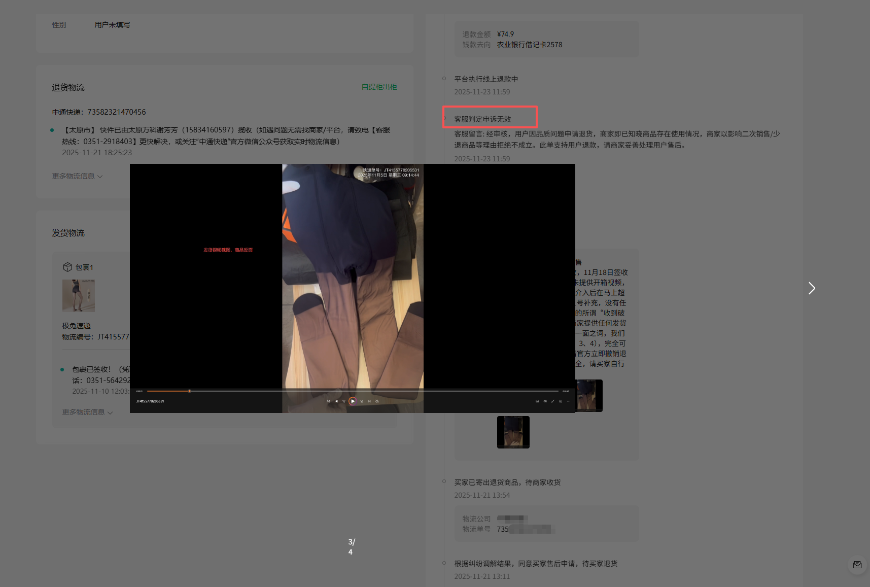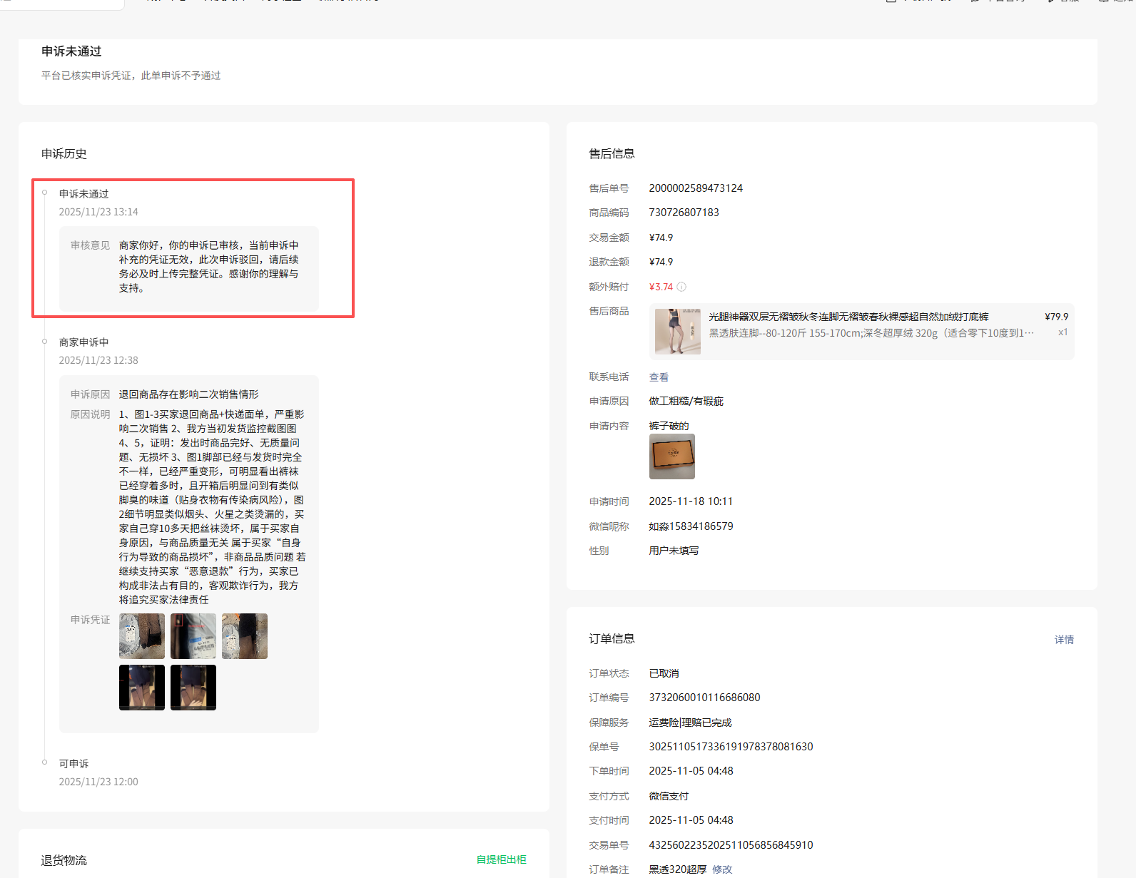买家于2025-11-05 04:48向我方在视频号小店电商平台购买一条贴身连裤袜(俗称光腿神器),订单号:3732060010116686080,于2025-11-10 12:03:27签收,买家于2025-11-18 10:11(为期8天)申请售后理由“做工粗糙/有瑕疵”说裤子破的,期间一直未提供证明,如开箱视频、快递面单破损位置等,2025-11-21 08:09,(距签收时间已11天)上传凭证,照片可明显看出破洞为人为损坏,且多处穿着痕迹,但微信小店客服审核人员在未了解清楚事实的情况下,私自支持买家行为,且我方申诉材料完整依旧被微信小店审核员拒绝。我方收到退回货物发现商品确为脚部明显穿着痕迹、破洞明显人为损坏,且我方发货时货物完好,包装完好,属于买家个人损毁衣物恶意退款及投诉,但在我方提交完整的发货视频截图、买家退货开箱截图,证明为买家人为损坏后,平台依然判定为我方责任,并在证据充足情况下以“补充凭证无效,凭证不完整”为由拒绝申诉,前提是买家上传的证据明显不足。有偏袒买家行为。我方与买家在平台客服系统沟通后,可证实为买家自己穿破的,属于买家个人行为导致商品破损。实为微信小店客服人员随意判罚,导致我方损失货款,现我方要求退还商品金额74.9元、3.74元的平台额外处罚、运费险0.8元,及取消微信平台对本店的售后率、品退率处罚。