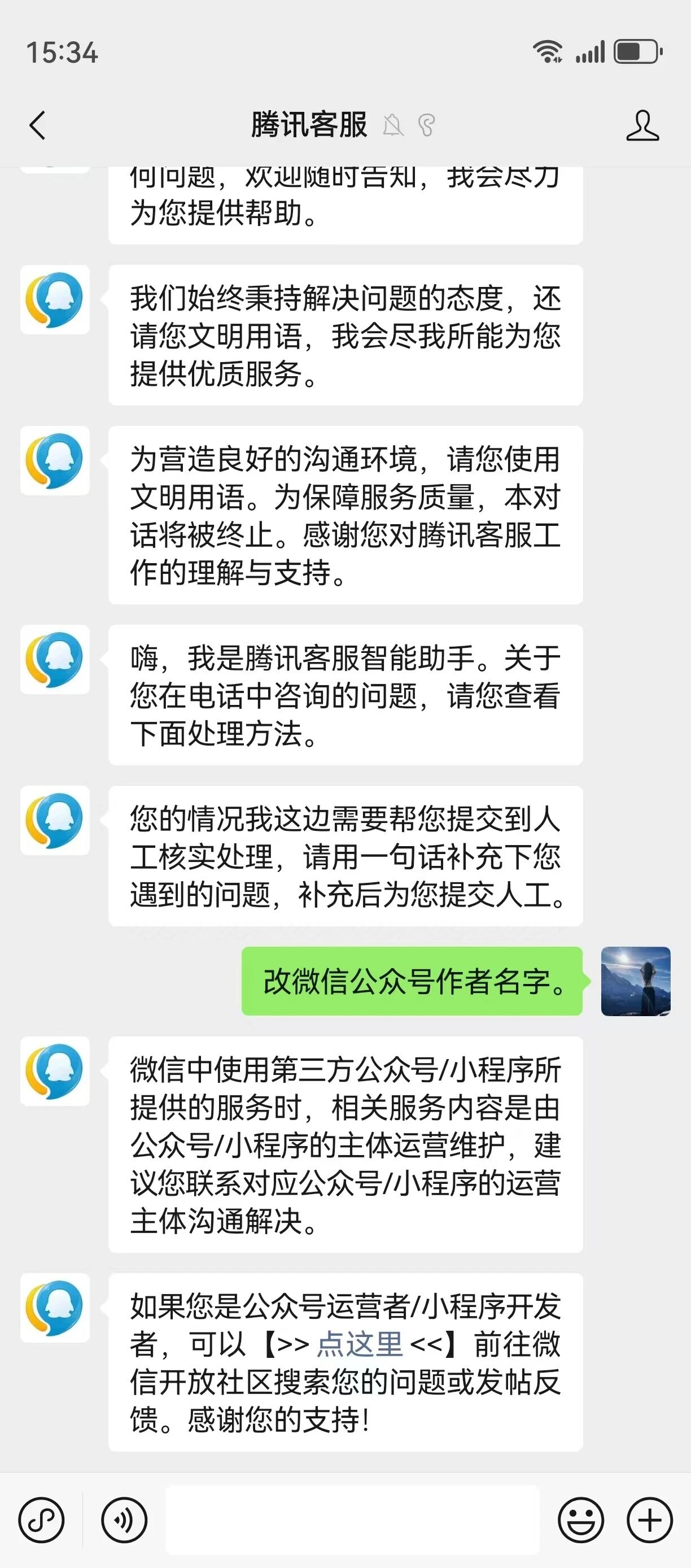 从我遇到问题开始,一直是智能客服在回答,在网站上面找到电话还是智能客服,说是问题已经在微信上会有客服回复我,让我在30分钟内打开微信客服界面,我点进去又再次回复,结果又到论坛,每次点进去全是论坛,而且论坛没有真正的客服在回复,全是网友在回复。我想问腾讯客服,是不是真的已经穷到招不了客服,既然穷为什么游戏上面又能找明星代言,还是说你们就是吃人不吐骨头的,只会让别人掏腰包,遇到问题都是自己解决。我有史以来第一次接到腾讯客服电话是因为我要缴纳公众号的费用,其他从来都是智能客服,以前遇到的问题全都没有解决,最后总结一下,如果花着别人的钱不帮着处理别人的事,这种早点倒闭吧