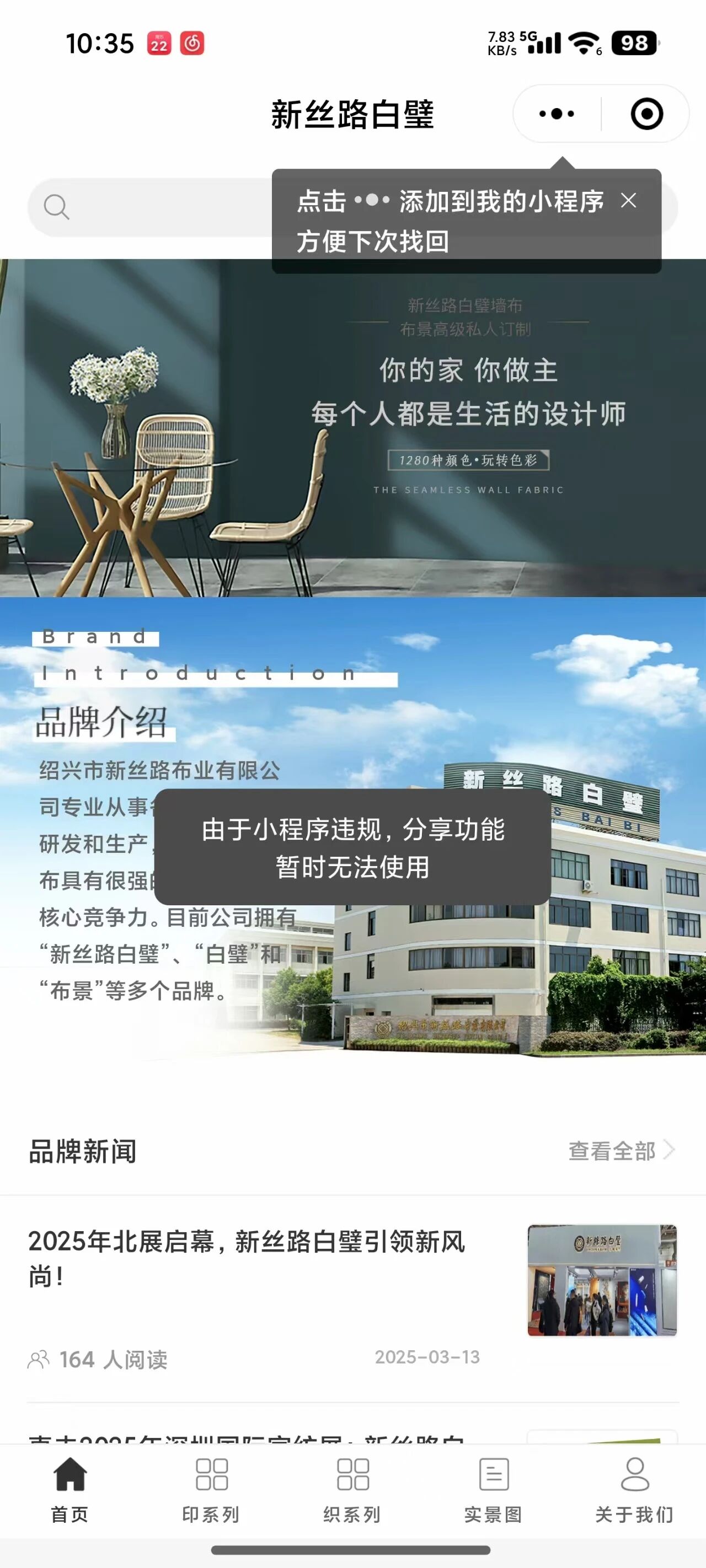 我们的小程序名称叫:新丝路白璧,账号是:gh_1f4406798831,现在无法转发。(如下图片,显示:由于小程序违规,分享功能暂时无法使用)