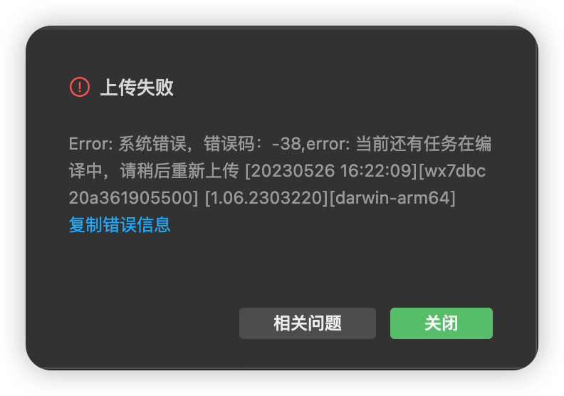 message:Error: 系统错误,错误码:-38,error: 当前还有任务在编译中,请稍后重新上传 [20230526 16:22:09][wx7dbc20a361905500]