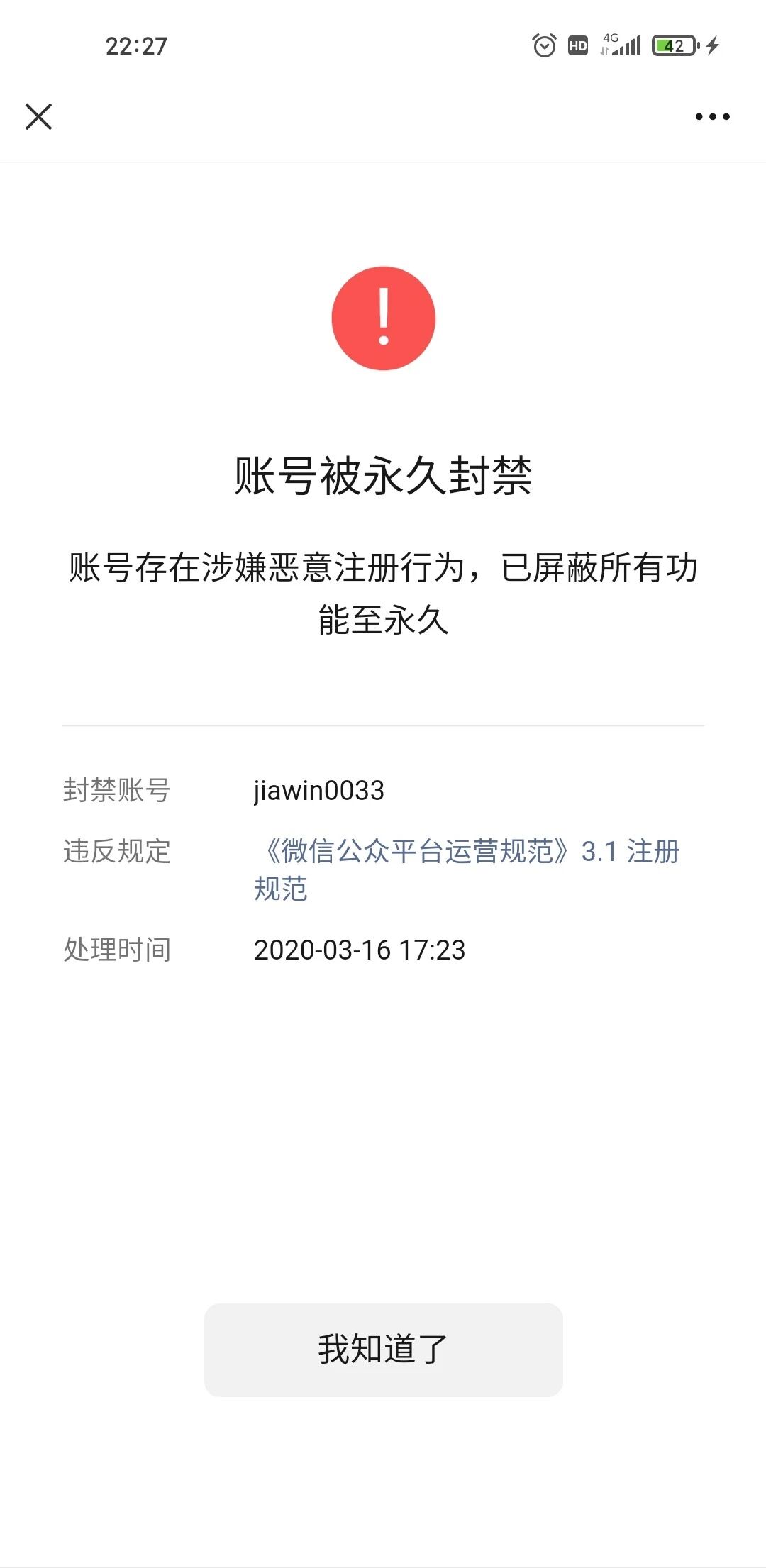 我公众号一直都遵从规范守则,正常使用,不知怎么回事说我涉嫌恶意注册被永久封号,请官方给个说法。