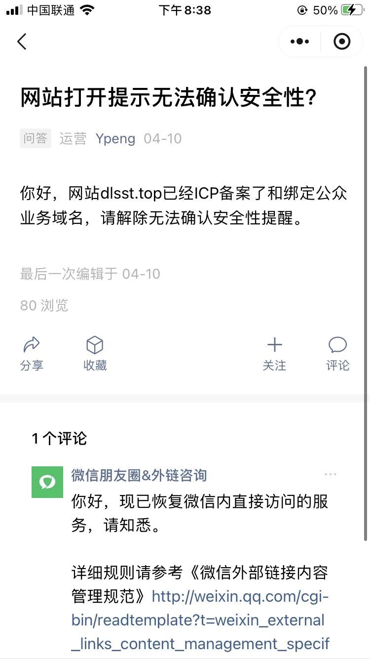 你好,网站dlsst.top已经ICP备案了和绑定公众业务域名,请解除无法确认安全性提醒。