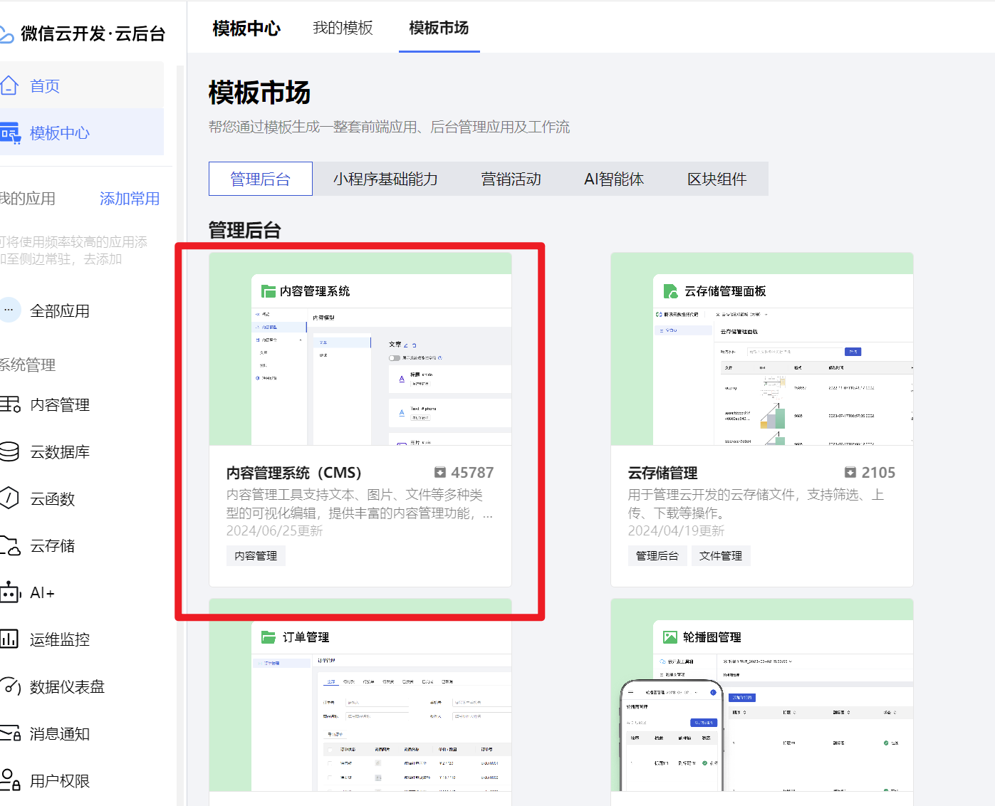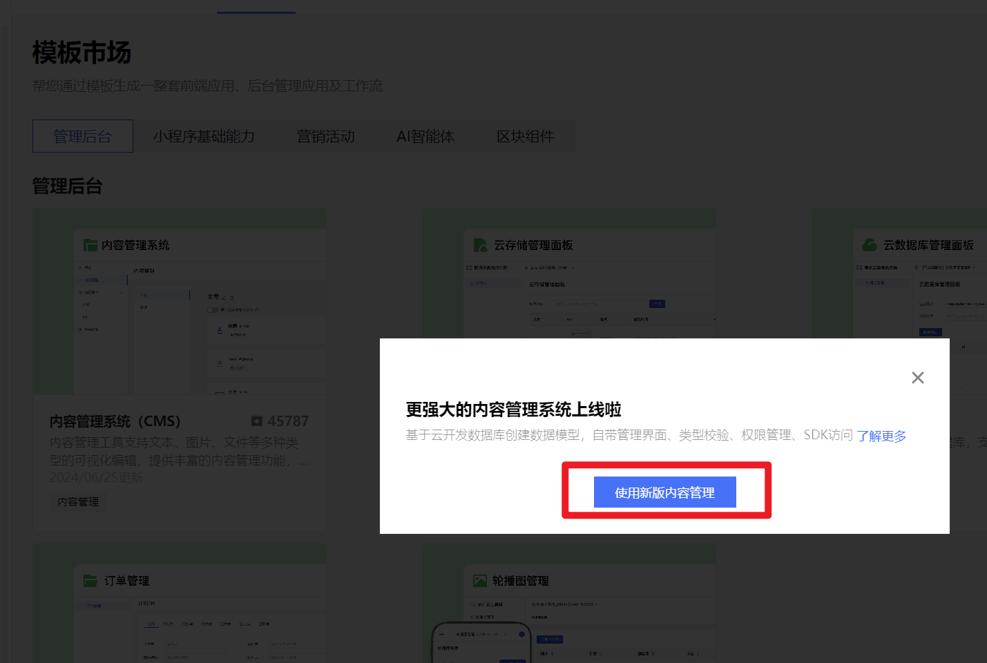 模版中心的内容管理系统(CMS),被拆分为了 云数据库应用中数据模型 和 内容管理应用 两个模块,内容管理应用中使用比较直观