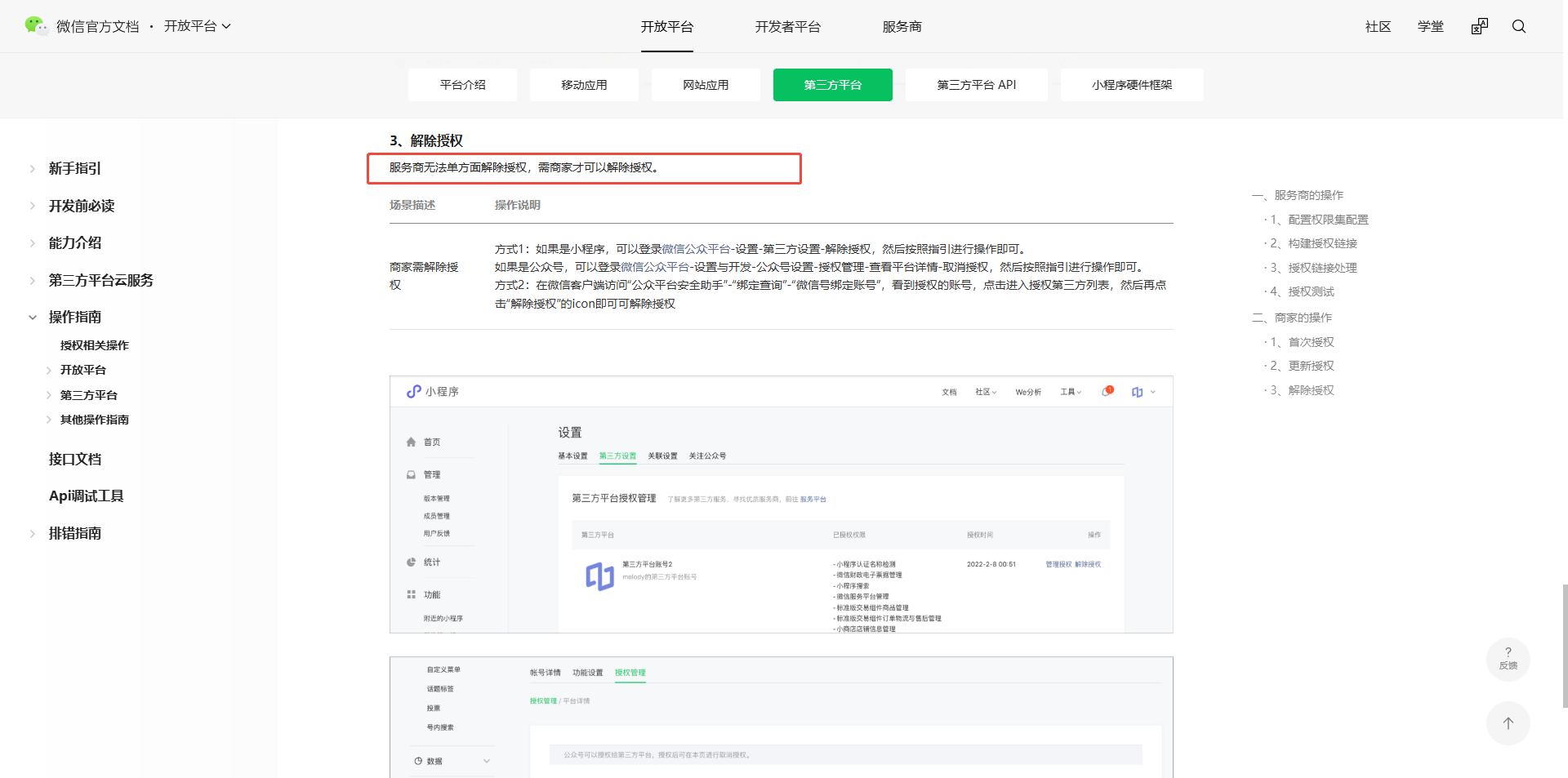 你好,如需授权给第三方平台服务商,请联系需要授权的第三方平台服务商沟通;如需解除授权,参考此文档:https://developers.weixin.qq.com/doc/oplatform/Third-party_Platforms/2.0/operation/authorization/authorization_management.html#_3%E3%80%81%E8%A7%A3%E9%99%A4%E6%8E%88%E6%9D%83