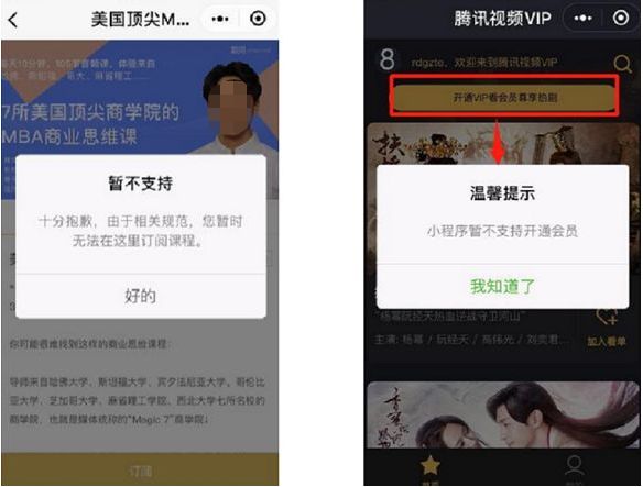 以小程序【网易公开课精品】、【腾讯视频VIP】为例,iOS端点击订阅、开通VIP服务,前端直接拦截提示不可服务。但如果iOS端页面呈现货架价格,提示购买行为的,也会被拒绝。比如: